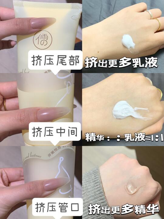 这个素颜霜有一个比较神奇的设计,它是双管的设计,外管是舒缓保湿精华,内管是提亮的乳液,宝宝们可以根据自己对保湿提亮的需求按压不同位置挤出乳液和精华的比例噢(使用方法我已经贴图放在图5啦)上脸润润的,不用担心会搓泥或者粘腻🥰,涂完就是很清透的底妆。50g大容量只要一杯奶茶🥤钱,平常用来擦胳膊擦腿🦵🏻均匀提亮肤色,完全都不会心疼👍,而且还能持妆一整天!!