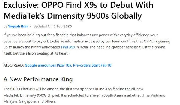 继网间陆续曝光了OPPO Find X9 Ultra的外观、配置以及或将于3月17日发布等消息的同时,网间也曾曝光过疑似OPPO Find X9s系列的部分配置信息。日前,有海外爆料博主再次曝光了疑似OPPO Find X9s将全球首发联发科天玑9500s的消息,将实现重载游戏的满帧输出与能效平衡。同时,网间还曝光了疑似该系列新机Pro版的外观。据称该系列新机也将于3月发布。