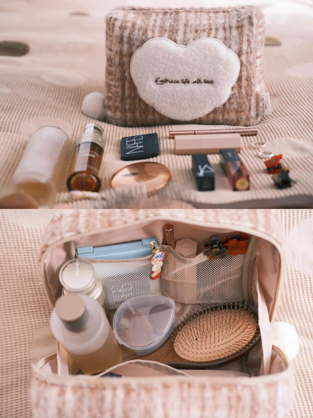 迫不及待分享近期出行我的心头爱 BaoBaoLife的毛绒收纳包包 美貌外表下 不再是只能装可爱的小小容量 大瓶水乳也可以轻松装下 毛绒绒的羊毛羊驼毛混纺面料 是柔柔软软的触感 忍不住想rua~ 前后夹层加厚保护 分区合理 很方便找寻拿取东西 用来当化妆品收纳包 或是放我的床搭子都很合适! 实用度拉满🥰