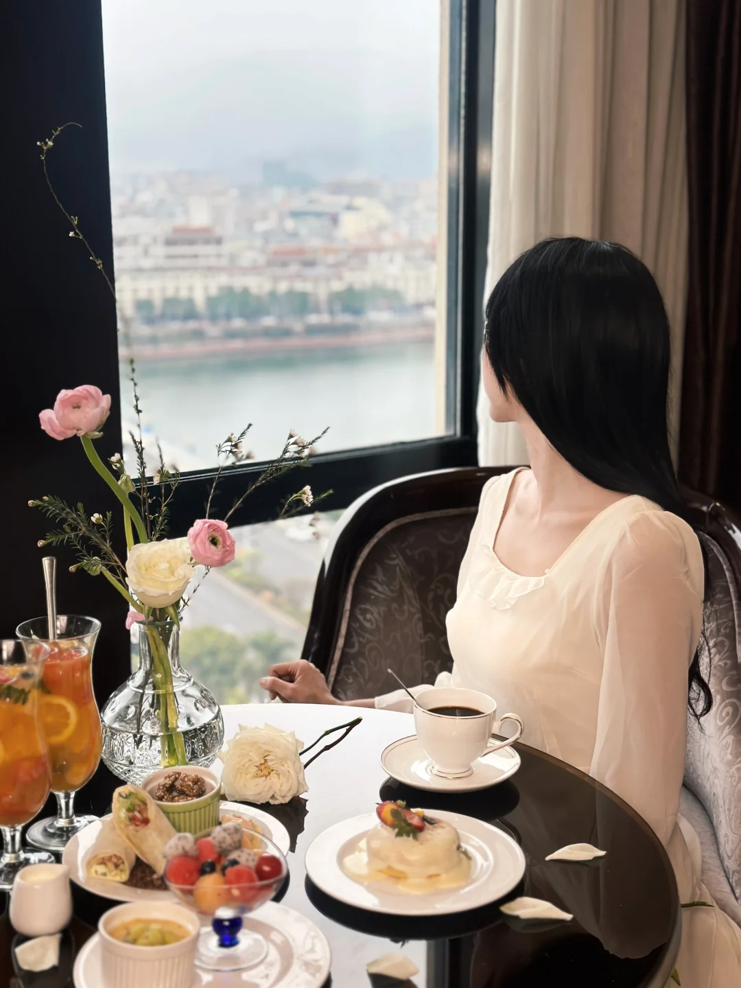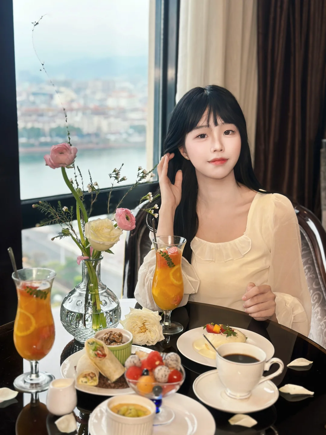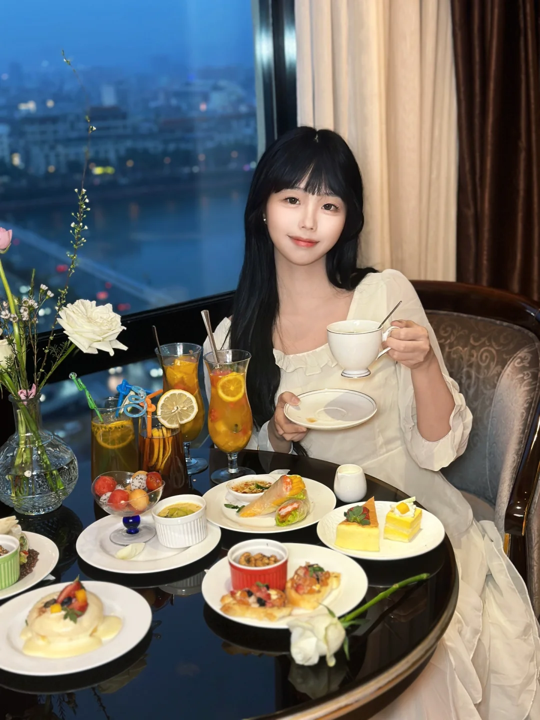15楼高空餐厅🍴建议大家穿优雅、法式的衣服,尤其是晚上5:00左右,华灯初上,蓝调河源,真的很好看💗
