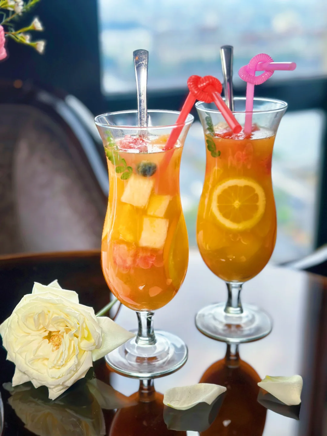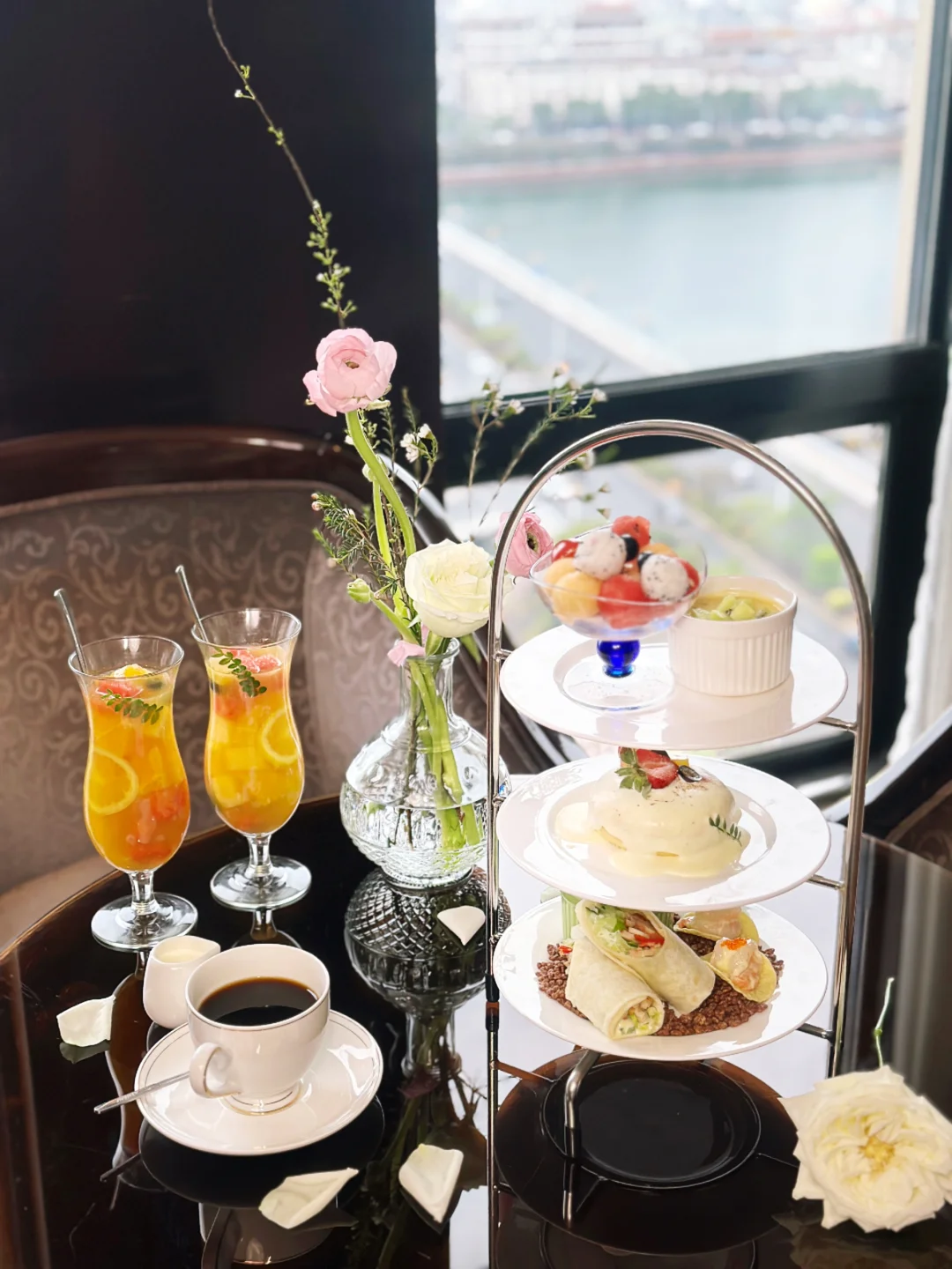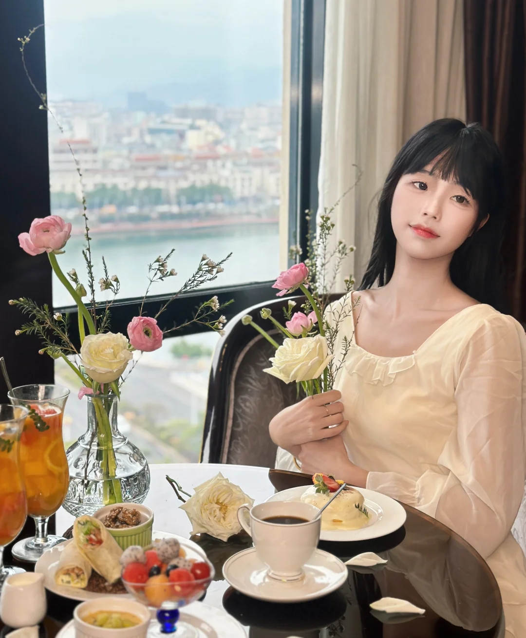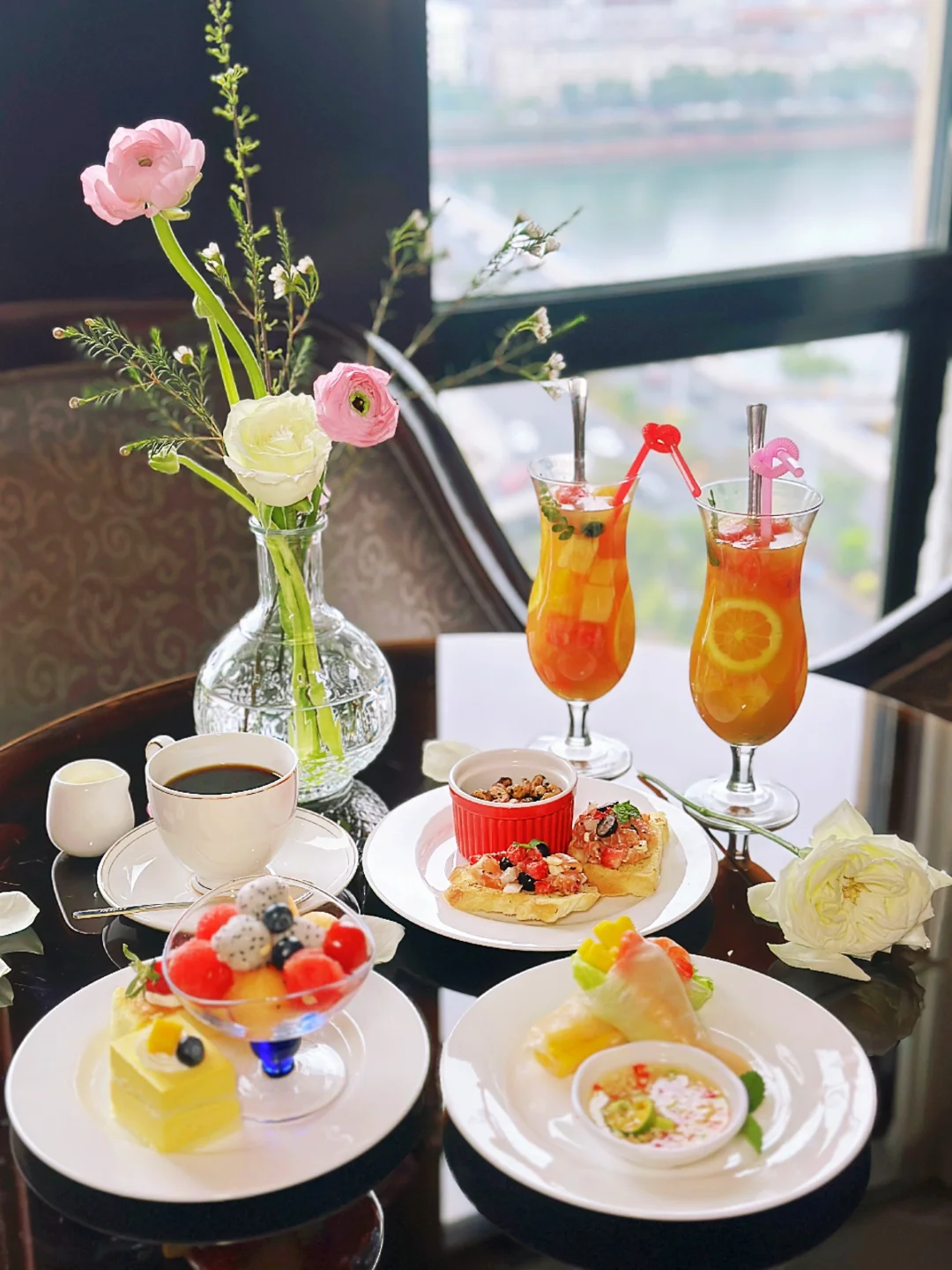 15楼高空餐厅🍴建议大家穿优雅、法式的衣服,尤其是晚上5:00左右,华灯初上,蓝调河源,真的很好看💗