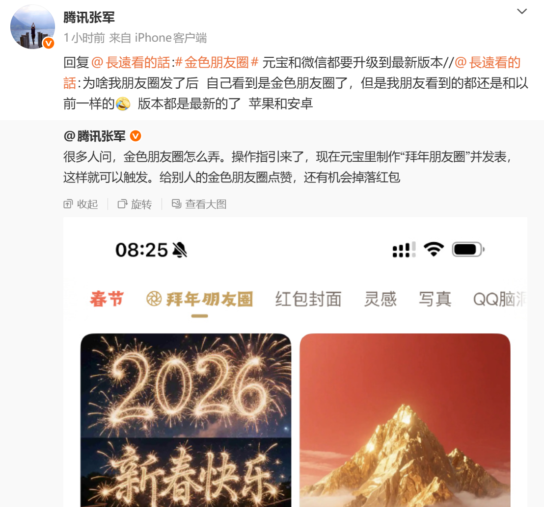 2026年2月16日消息,腾讯公司公关总监张军在社交平台发文称,元宝和微信升级到最新版本,可以发“金色朋友圈”,给别人的金色朋友圈点赞,还有机会掉落红包。