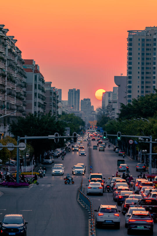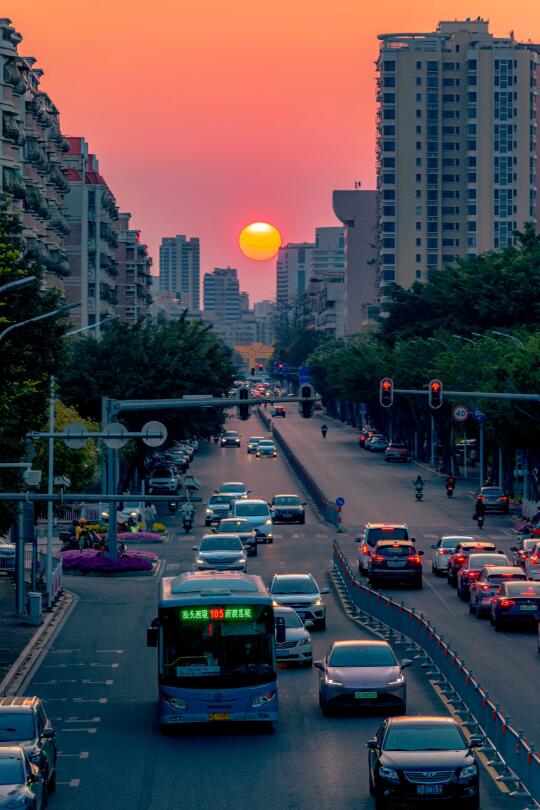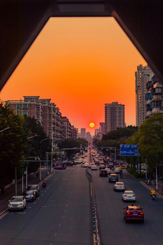 春分,日落在正西方,在前后几天里,汕头横跨东西方的大道比如金砂路,长平路,韩江路都可以看到太阳在正西方落下,如果你刚好往西边走,就可以看到迎面的日落!