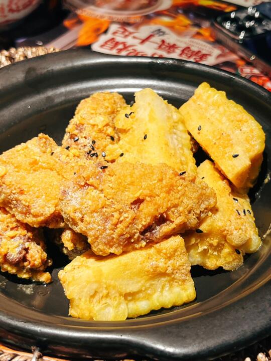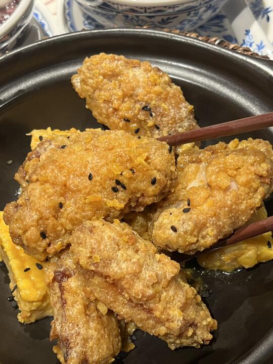让人欲罢不能的蛋黄焗鸡中翅,鸡中翅外皮裹上一层金黄的咸蛋黄,外皮酥脆,内里肉质鲜嫩多汁。咸蛋黄的咸香与鸡翅的鲜美yyds