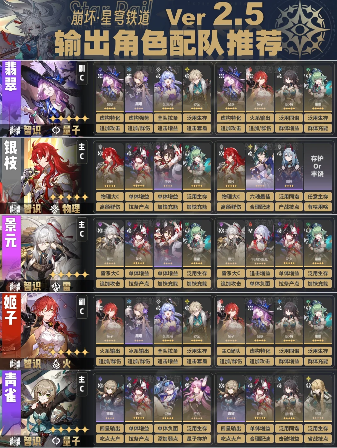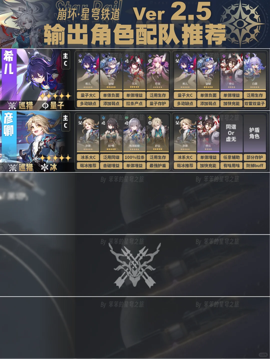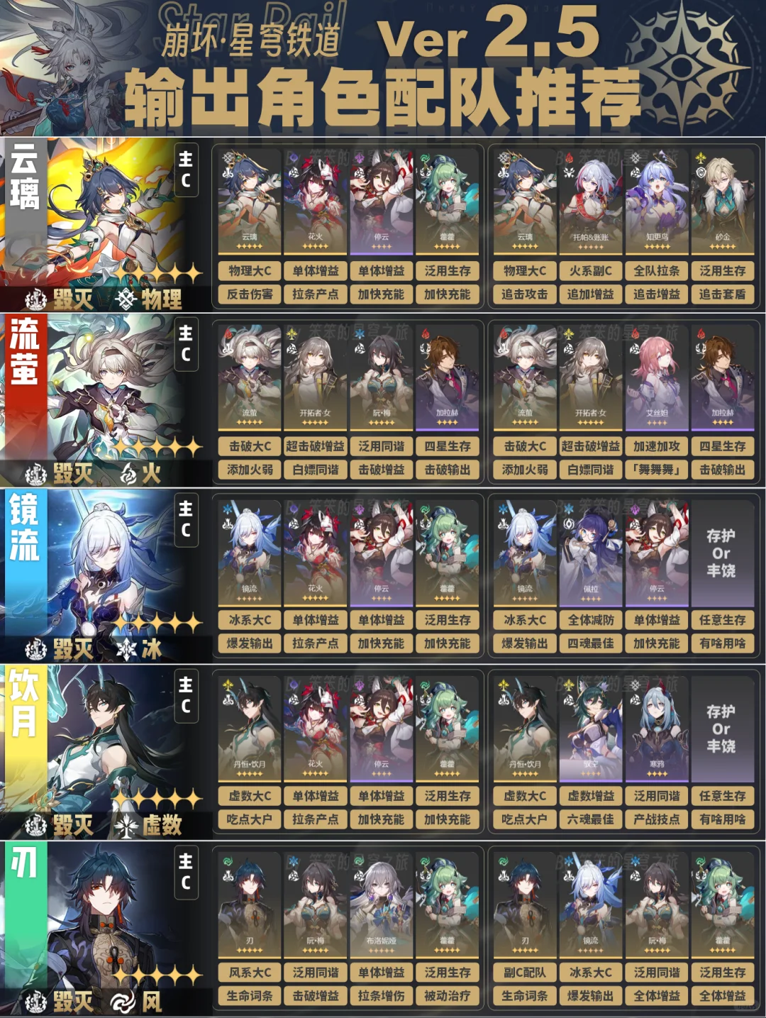 🐱大家好,我是笨笨的铲屎官 今天给大家带来的是2.5上输出角色配队 和上个版本2.3版本攻略新增了 飞霄、椒丘,还未含灵砂 ------------------------------------ 👉注意事项: ①左边的配队为该角色最强配队 右边配队可能为下位替代、可能为其他强势队伍 不同角色二队选择并不一样 ②配队肯定不全面,仅供参考 ③同谐位、虚无位、生存位并不唯一 大家可根据自己卡池的角色适当调整 ④你在用什么配队,笨笨是否漏了 欢迎大家补充