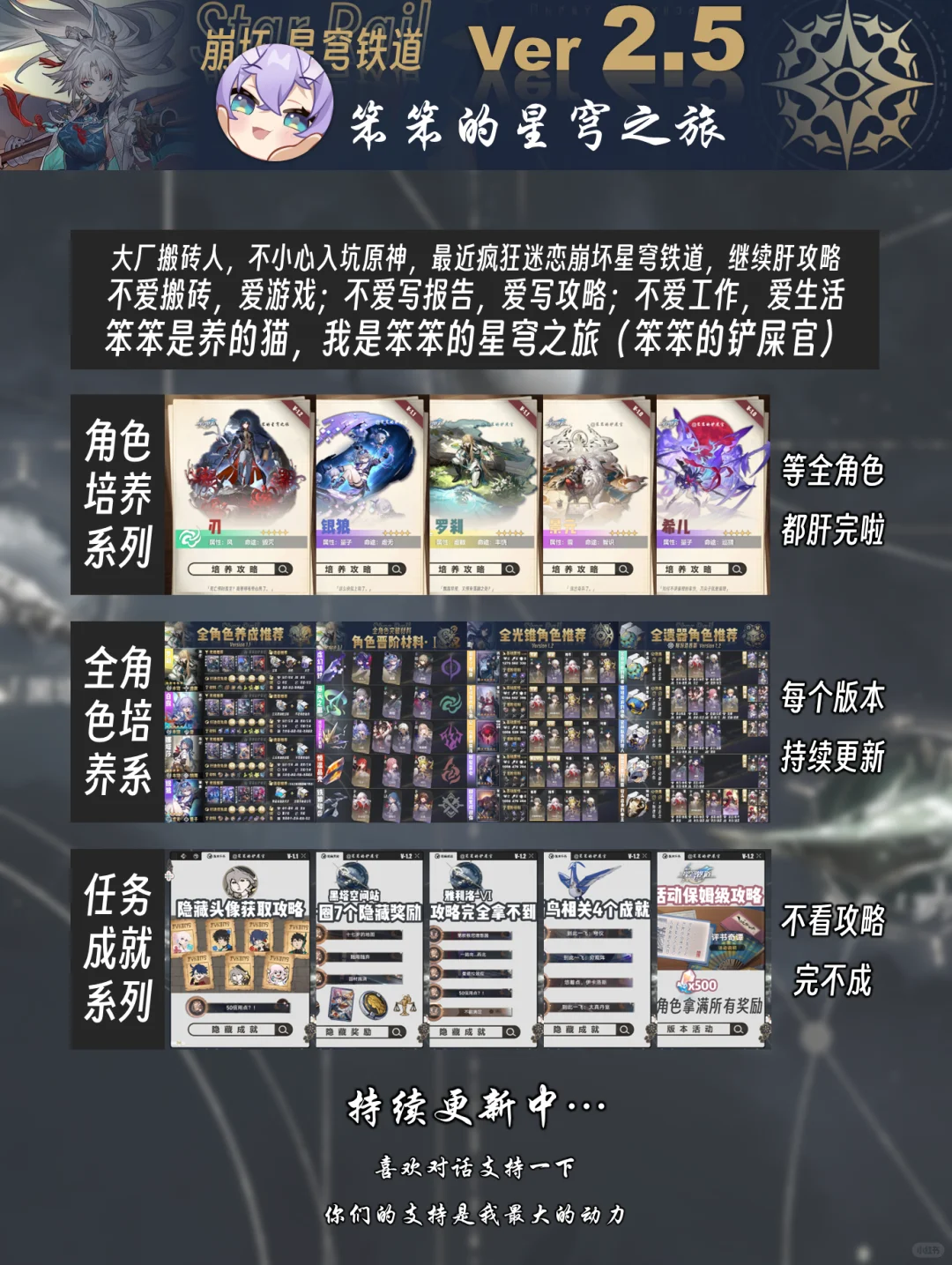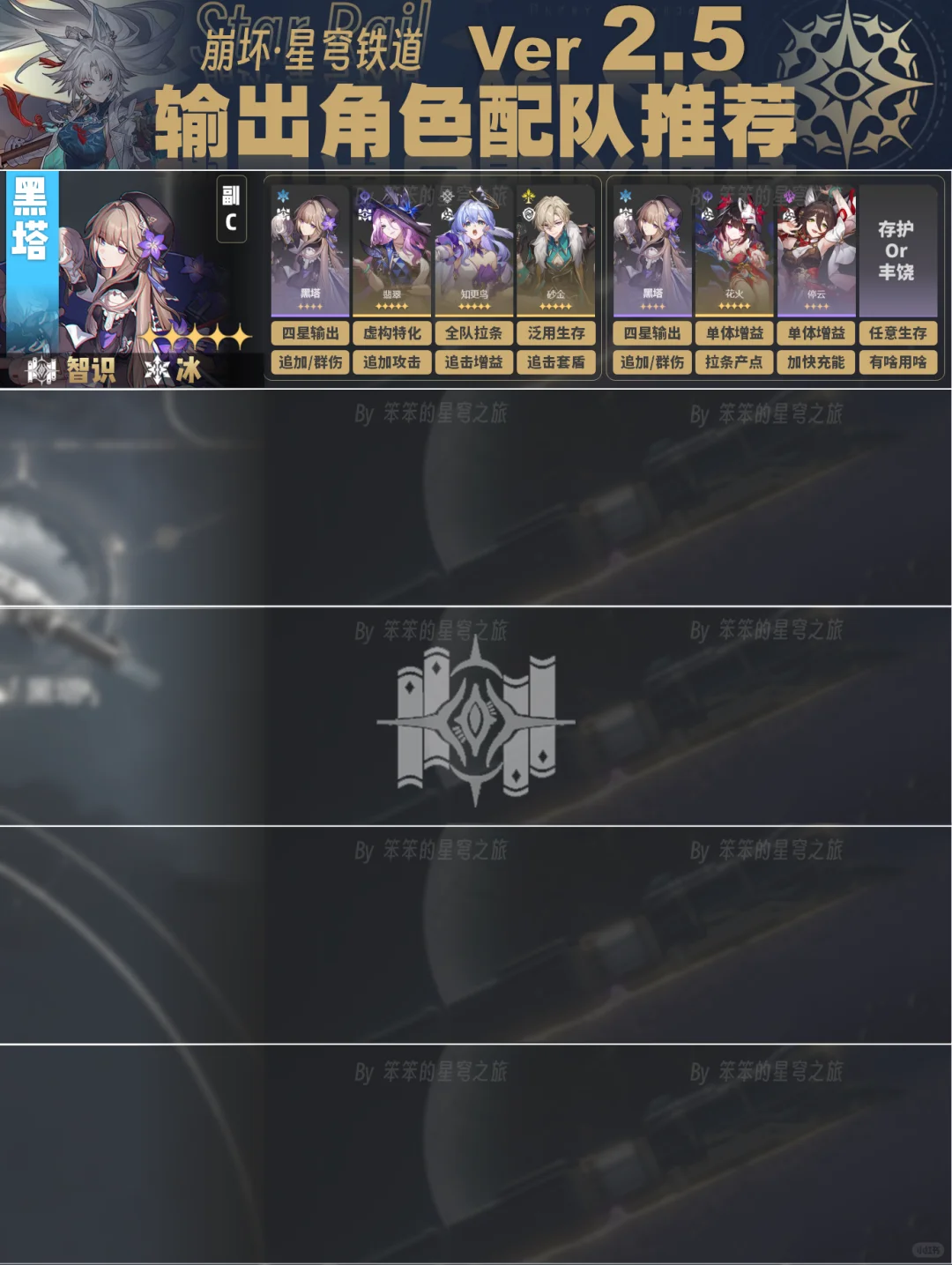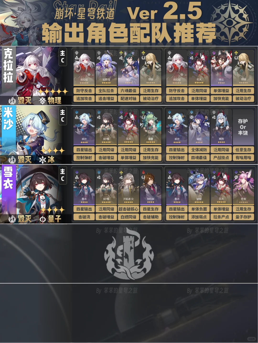 🐱大家好,我是笨笨的铲屎官 今天给大家带来的是2.5上输出角色配队 和上个版本2.3版本攻略新增了 飞霄、椒丘,还未含灵砂 ------------------------------------ 👉注意事项: ①左边的配队为该角色最强配队 右边配队可能为下位替代、可能为其他强势队伍 不同角色二队选择并不一样 ②配队肯定不全面,仅供参考 ③同谐位、虚无位、生存位并不唯一 大家可根据自己卡池的角色适当调整 ④你在用什么配队,笨笨是否漏了 欢迎大家补充