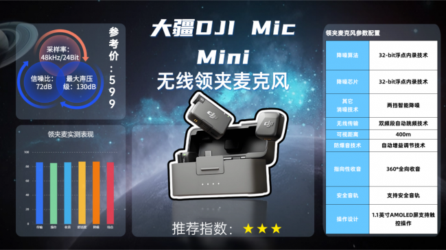 【使用体验】机身小巧便携,发射器仅重31克,佩戴隐蔽不突兀,支持一键开启降噪,操作直观便捷。采用2.4GHz数字传输技术,传输距离超100米,抗干扰性强,无需复杂设置,新手也能快速上手,适配各类专业创作场景。