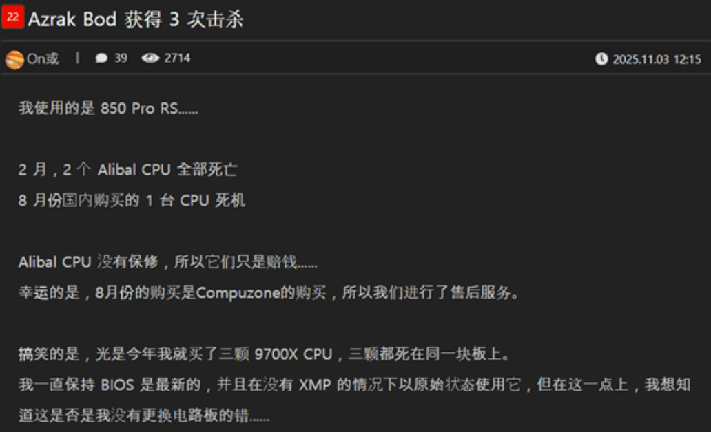 更让用户寒心的是官方的态度:从问题爆发到回应拖沓数月,给出的BIOS更新补丁也没根治问题,结果还是一次次被新的烧毁案例打脸。到最后,分辨风险、更新BIOS的活儿全甩给了用户。也就是说,合着风险是用户担,成本也是用户扛?