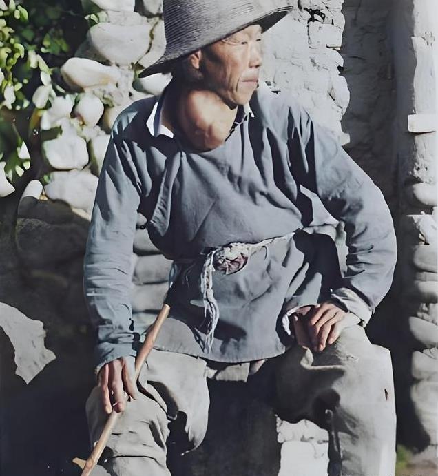这张照片定格了民国时期一位生活困顿的民众形象。他的脖颈上赫然生长着一个硕大的瘤块,显得格外触目惊心。遗憾的是,由于囊中羞涩,他无力承担治疗的高昂费用,只能无奈地任由病情拖延,日复一日地在痛苦与无助中煎熬,其境遇实在令人心生怜悯。如此庞大的瘤子,无疑成了他日常行动的沉重负担,无论是劳作还是生活琐事,都因此而受到了极大的限制与不便。