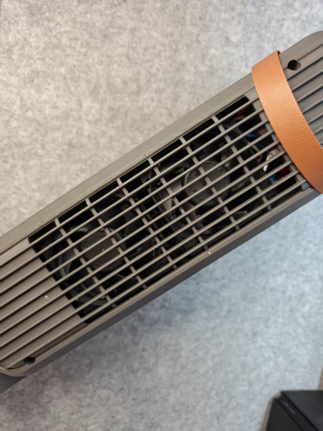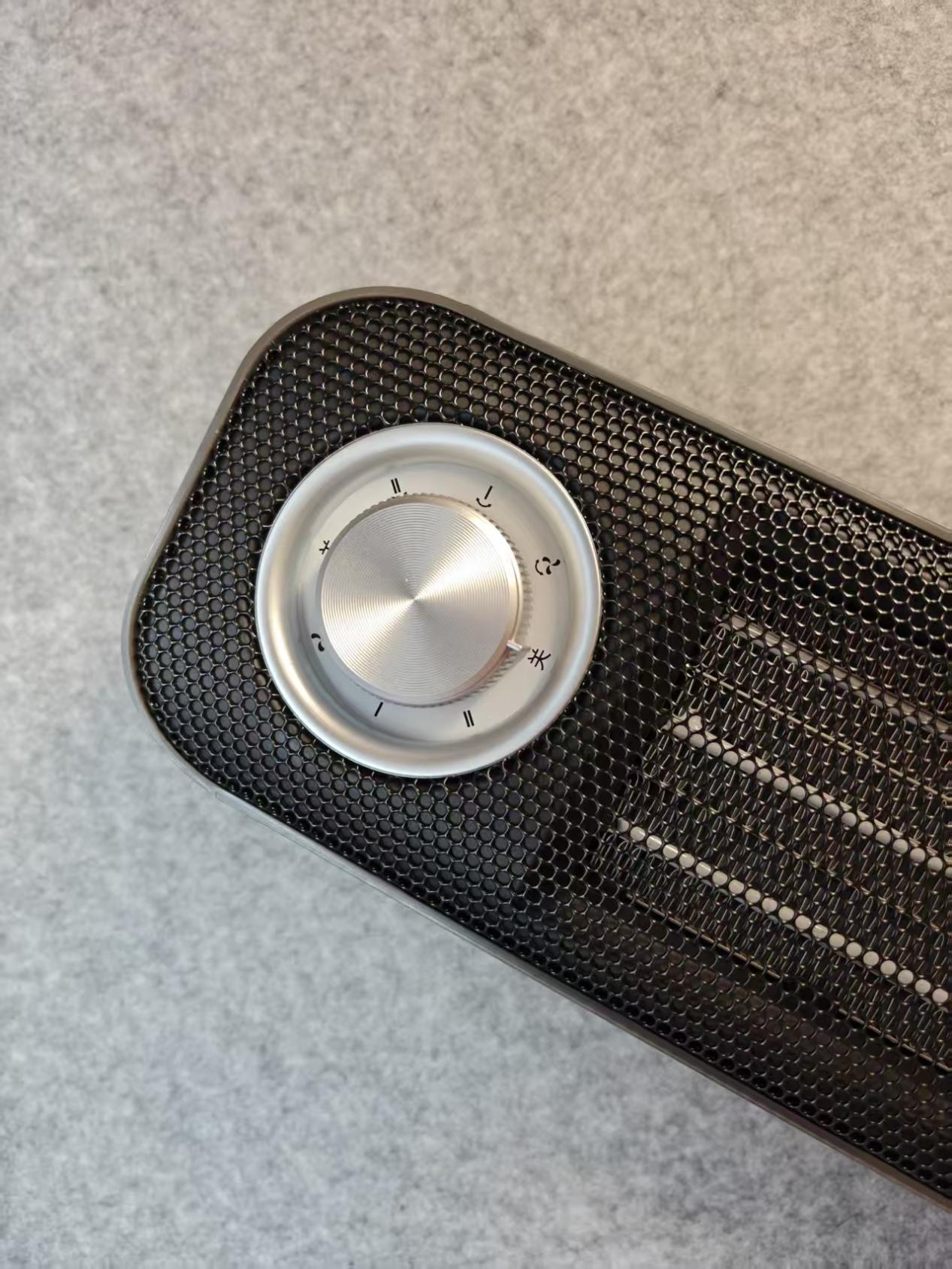 顶部的皮革提手是点睛之笔,不仅触感舒适,即便机器连续运行两小时,提手仍保持常温,女生单手就能拎起,在客厅、卧室、书房之间灵活挪动毫无压力,对比传统油汀“搬一次喘半天”的体验,幸福感大幅提升。操作区域设计得格外友好,机身顶部的圆形旋控按钮清晰标注6个档位(摇头暖风二档、摇头暖风一档、摇头冷风、冷风、暖风一档、暖风二档),阻尼感适中,老人和孩子看一眼就能学会操作,无需对着说明书研究。底部的防滑减震垫也很实用,放在瓷砖或木地板上开启摇头模式时,机身稳如磐石,不会出现“嗡嗡震动”的情况。