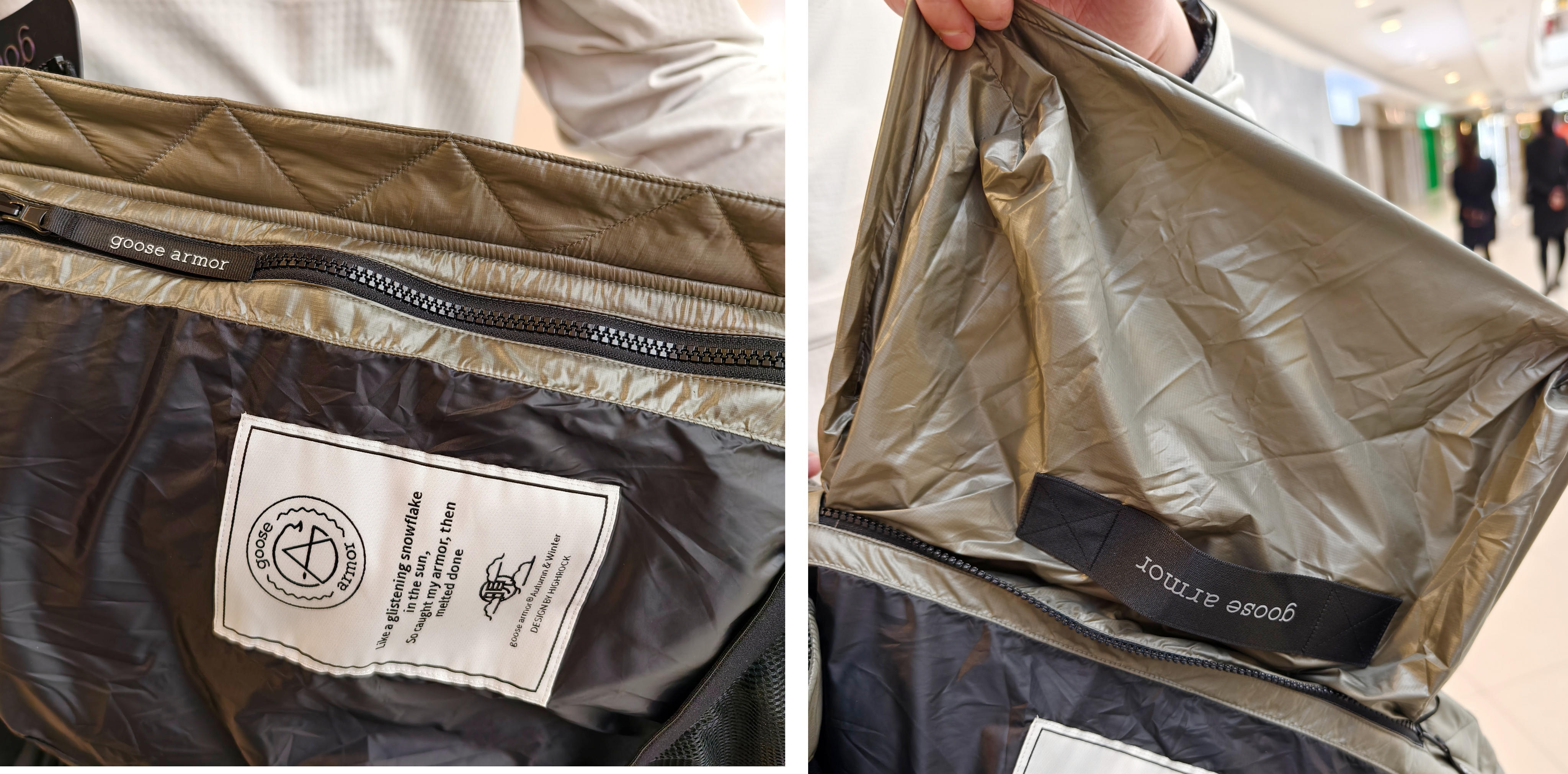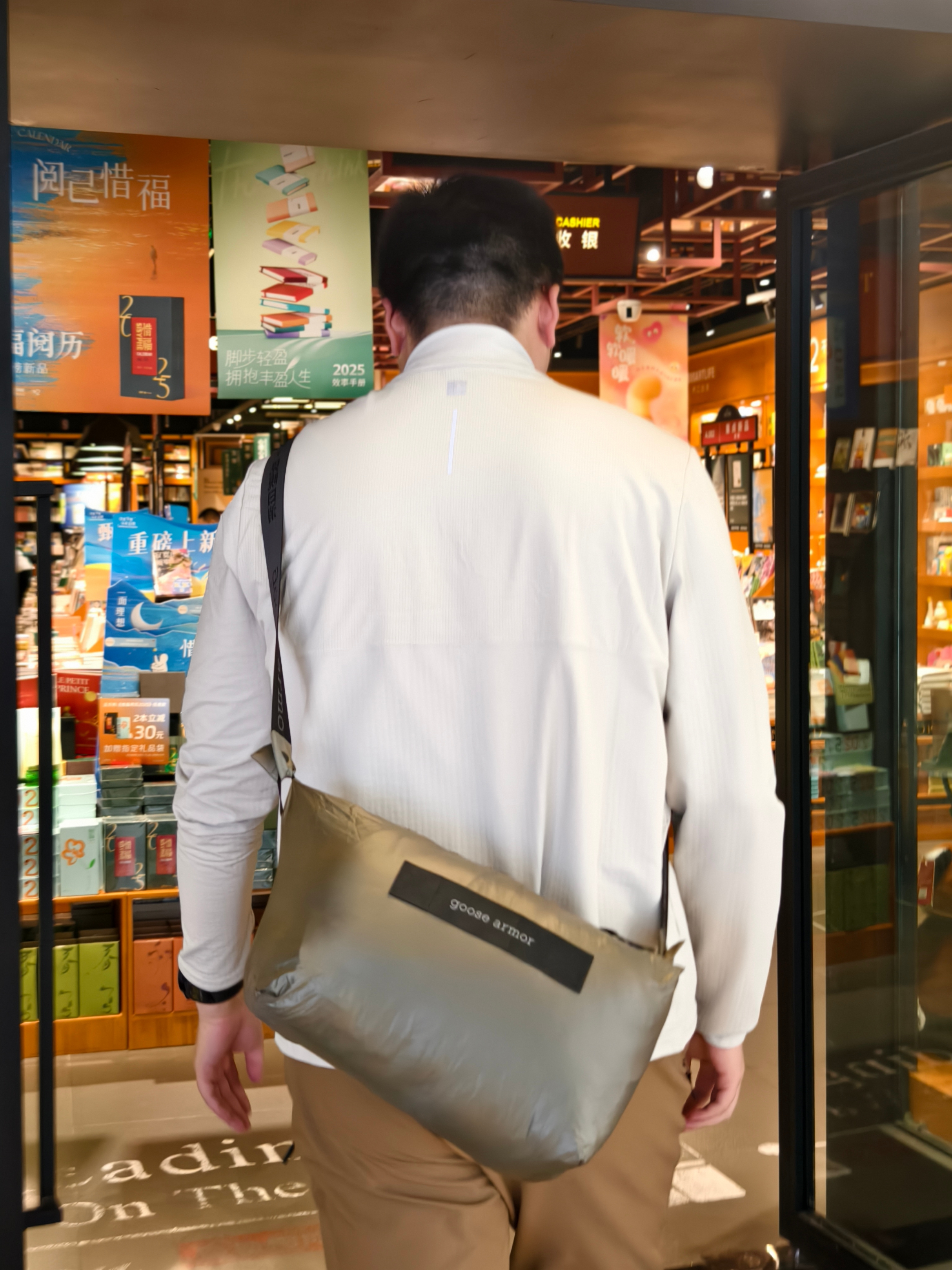 当然最受年轻人喜欢的要属它的多变形态了,比如说我吧,工作在城市繁华商业街,商场的供暖系统都非常强,室内很热。经常衣服都是在手里抱着很不方便,鹅铠甲用一个隐内置口袋解决了这个问题。如果短时间室内逗留可以双肩背,长时间逗留就可以折成小包包背在身上,实在是非常高明的设计。我十分钟意。