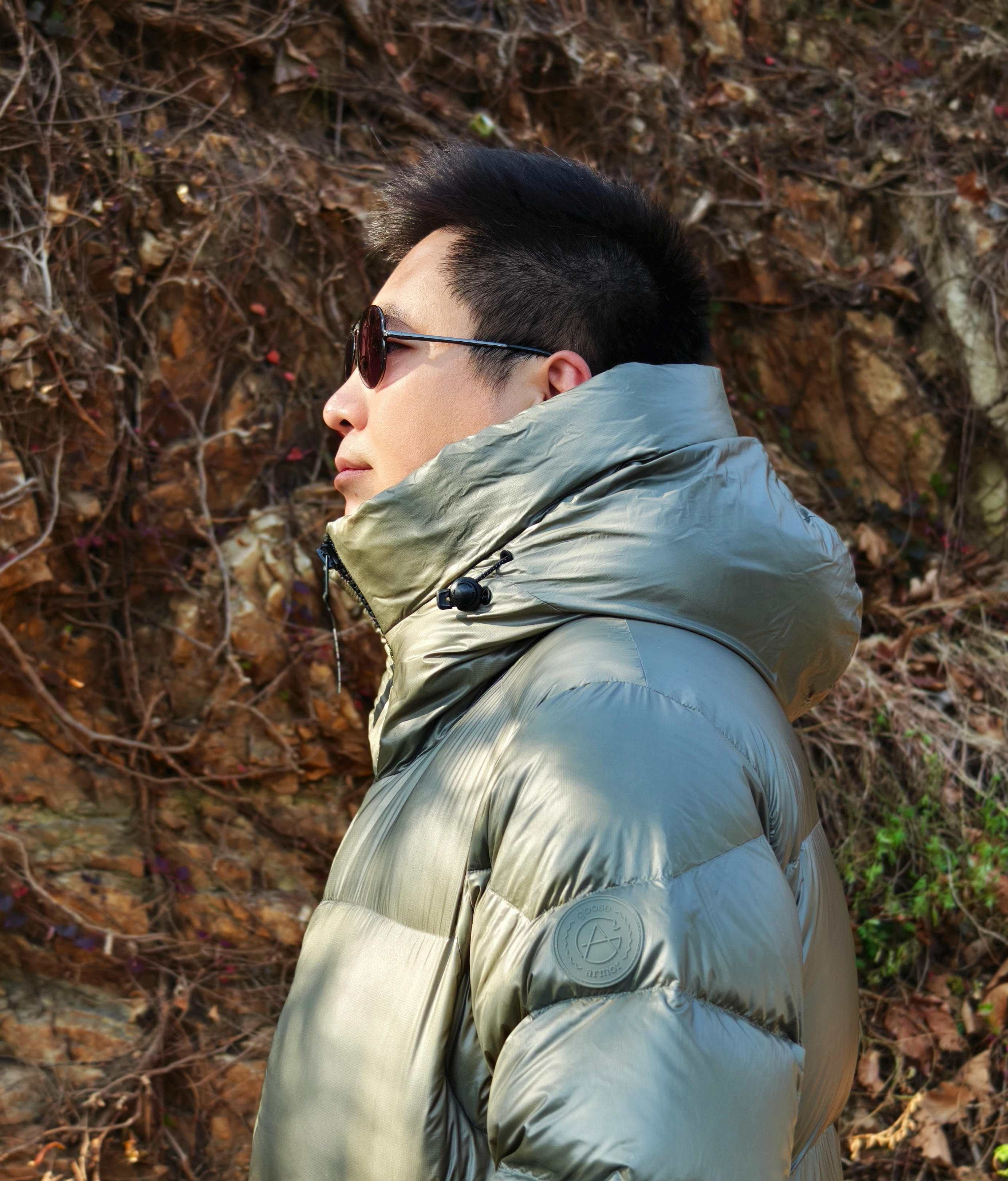 看看这色泽在阳光下非常漂亮。我强烈推荐苍松绿这款色!百搭不沉闷。衣服内胆甄选了匈牙利进口白鹅绒,18mm大绒朵,800蓬95%的充绒量,1000+的清洁度,衣服品质绝对轻奢。