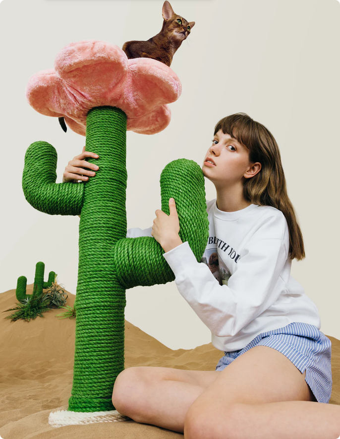 Vetreska品牌的产品线布局丰富,涵盖了猫爬架、猫砂盆、出行包、宠物碗等多个品类,将仙人掌、草莓、西瓜、樱桃、橙子等自然元素,与高饱和的流行色彩融入产品的设计中,打造出兼具功能性与社交属性的宠物家具。
