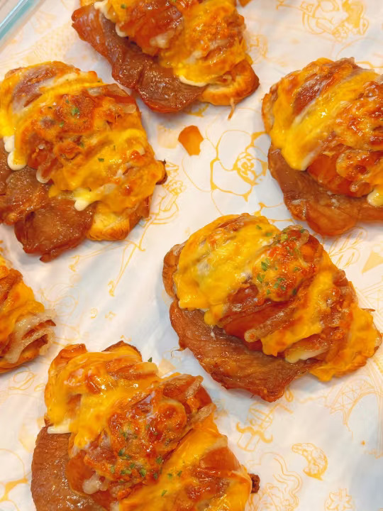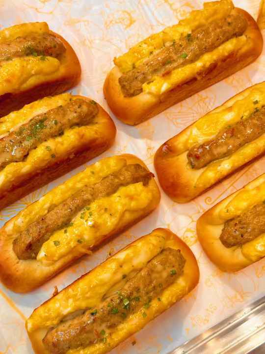 打开盲盒,里面有料多多的鸡胸肉披萨🍕料超足的火山石烤肠包🥪 还有芝士鸡肉面包🍞(面包是商家随机提供)