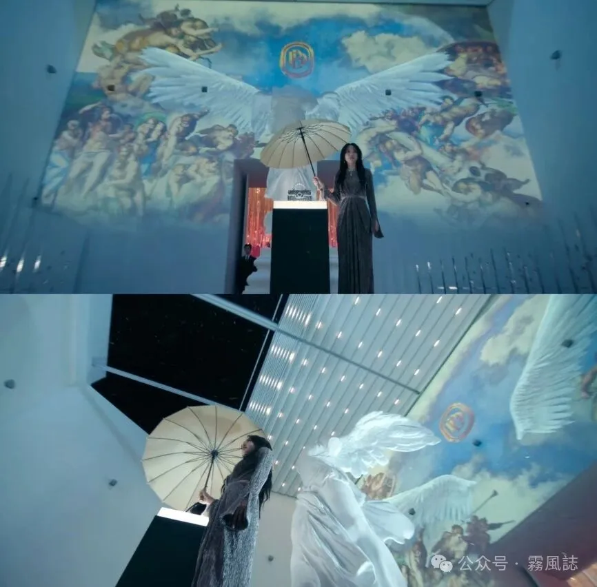 值得注意的是,剧中的投影壁画在原画基础上做了改动,即画面中心有一对大翅膀,这个翅膀要结合镜头中的道具一起看——包包展示台后面的雕像。