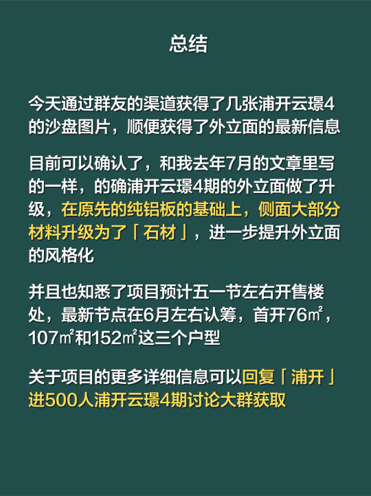 相比之前的纯铝板进一步升级,材质有了变化之后,看起来的色彩也会丰富一些 整个项目几乎外部能看到的区域全部都是石材+铝板,只有在连廊的天井内侧看不到的地方会有一些涂料 期待马上5月的样板间首开,预计6月首开