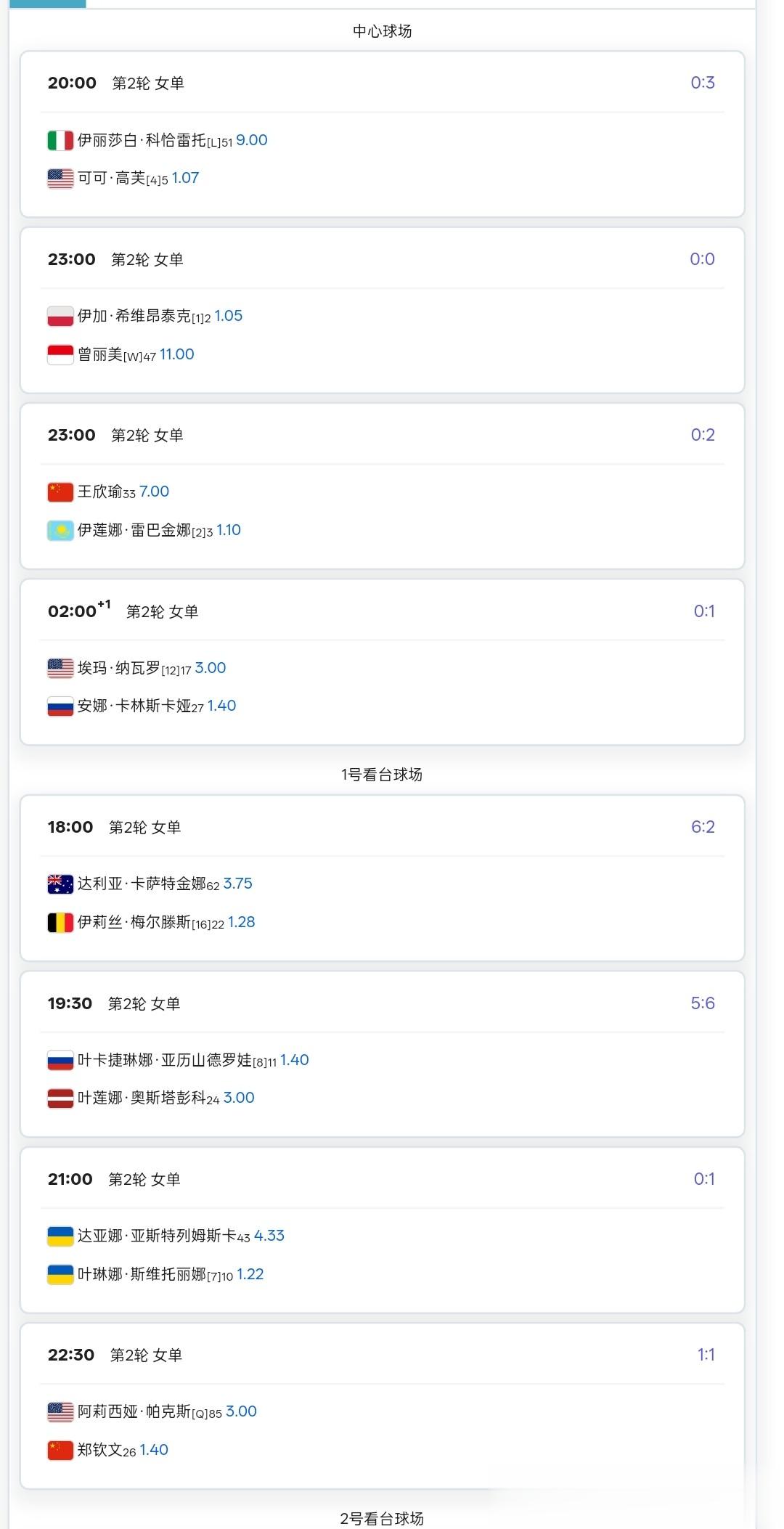 1号场:郑钦文午夜登场18:00 卡萨金娜 vs (16)梅尔滕斯
