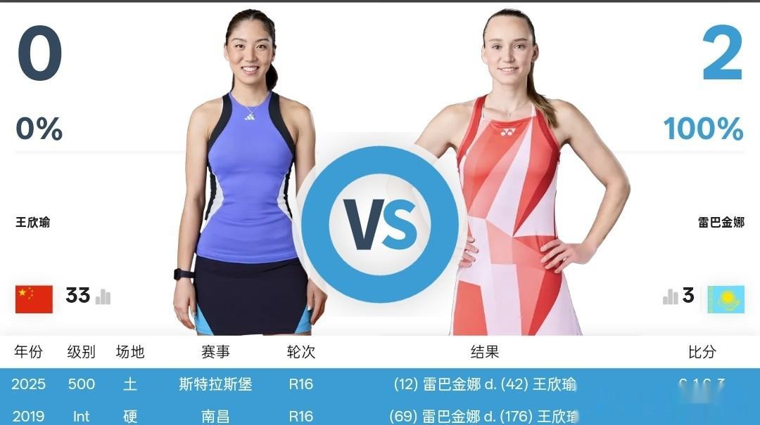 王欣瑜 vs 莱巴金娜王欣瑜首轮以6-1、7-5轻取哥伦比亚选手阿朗戈,新赛季保持11胜3负的火热战绩,即时世界排名升至生涯新高第32位;对手莱巴金娜是赛会2号种子、新科澳网冠军,本赛季保持全胜,首轮轮空后迎来本届赛事首秀,两人此前两次交手王欣瑜均告负。