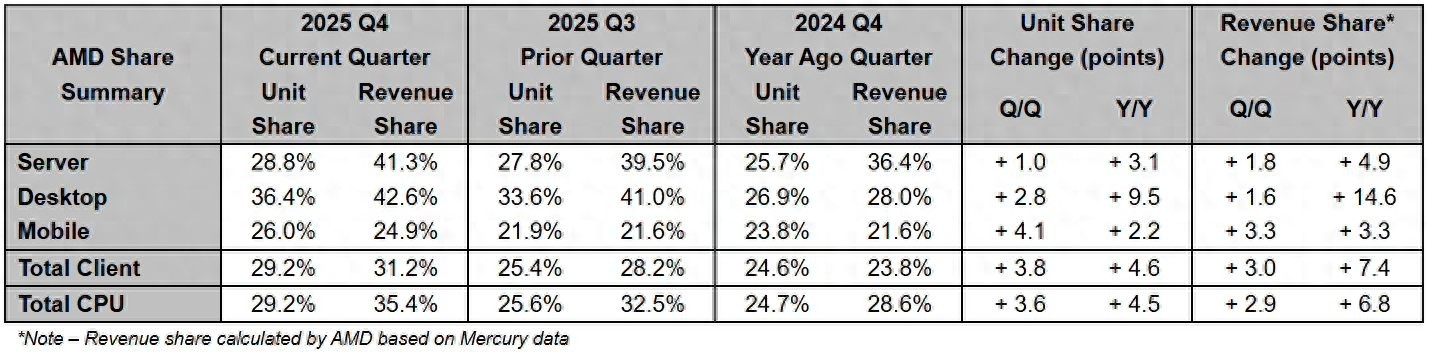 DoNews2月12日消息,市场调查机构 Mercury Research 于 2 月 10 日发布报告,显示在 2025 年第 4 季度,AMD 在全球 CPU 市场份额实现爆发式增长,出货额与出货量双双创下历史新高。