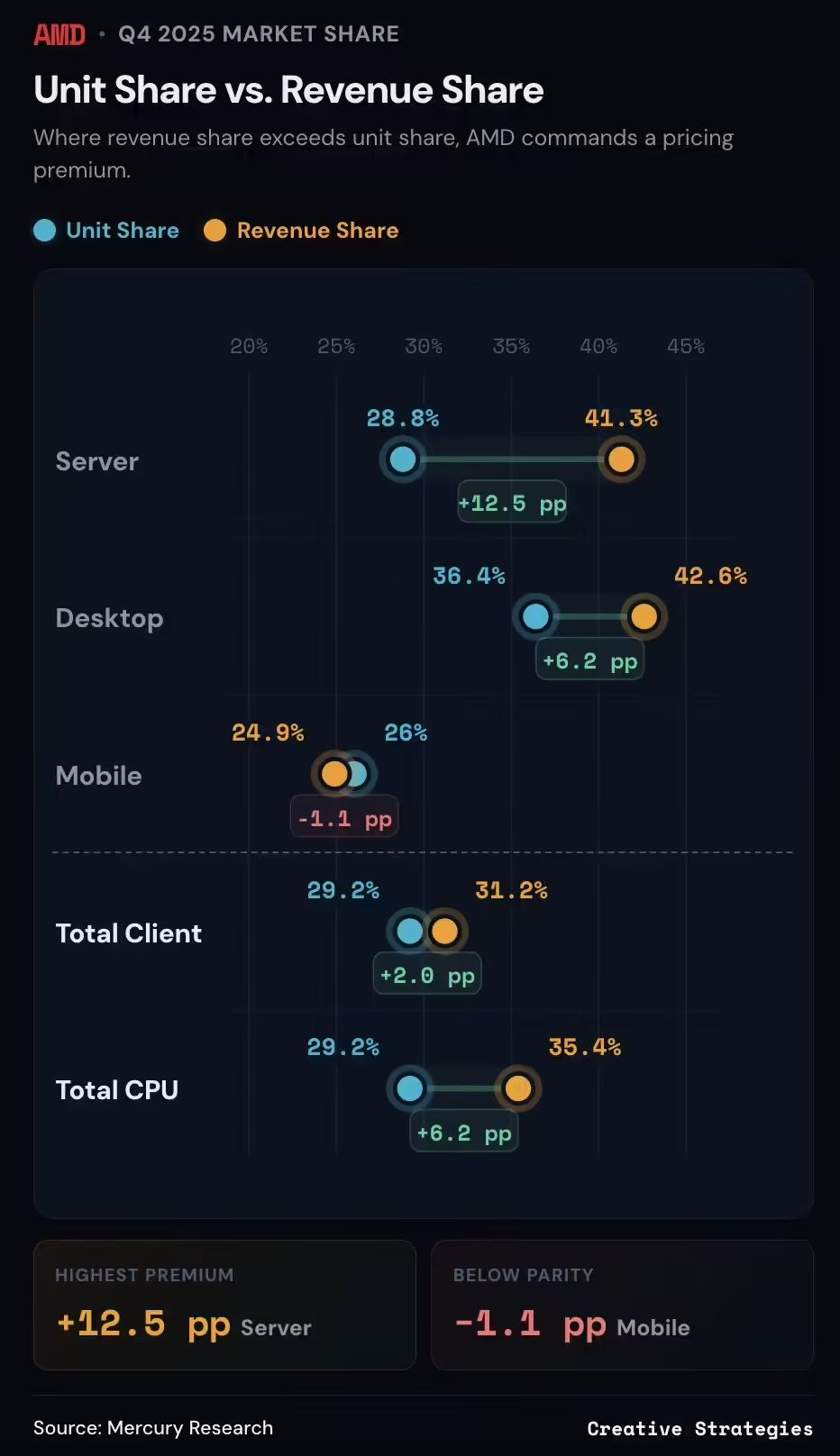 移动端方面,AMD 出货量份额提升至 26.0%,营收份额为 24.9%,同比均增长 3.3 个百分点。随着 Ryzen AI 400 和 Ryzen AI MAX 系列处理器的持续推进,AMD 在移动领域的市场份额有望进一步扩大。