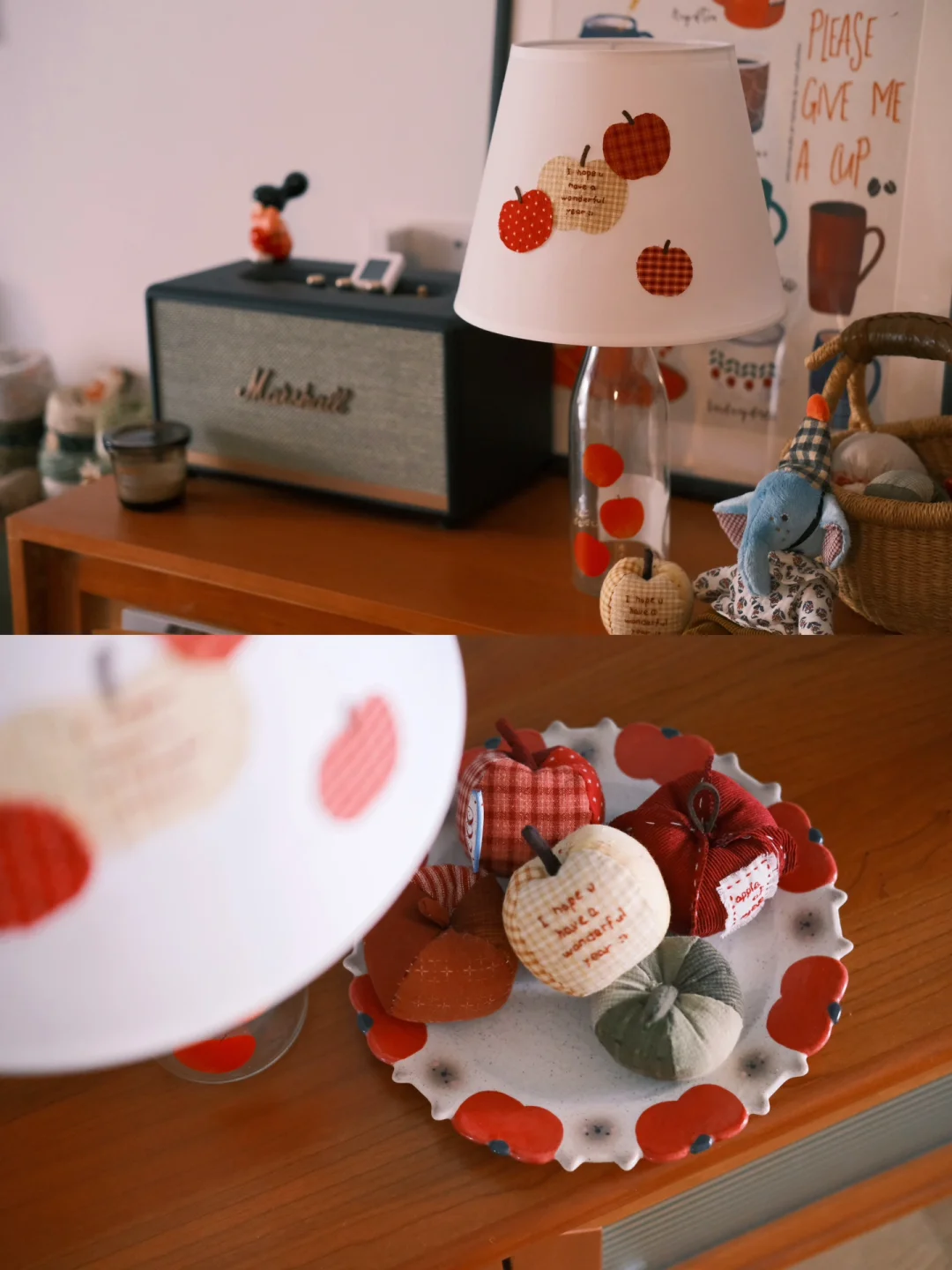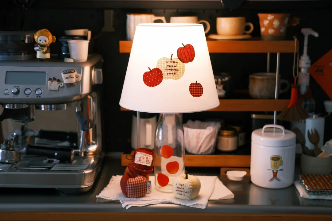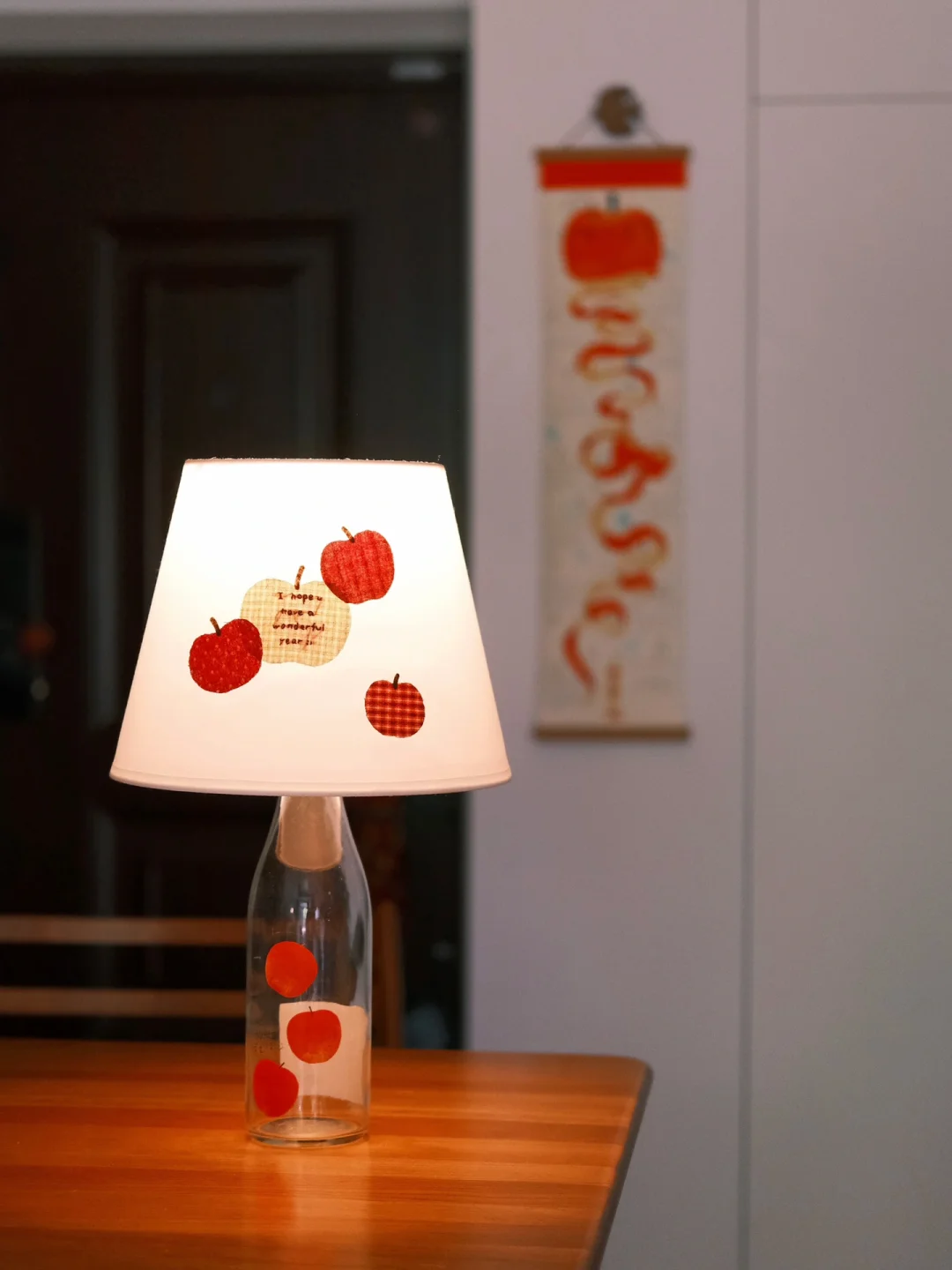 这只苹果清酒的空瓶是家里的老演员了 每年春天都会被拉出来酒瓶插花 最近刷到了好几回酒瓶灯 狠狠心动 用之前剩的布料拼贴了苹果灯罩 组合再一起 再找一只充电灯泡 家里的苹果元素再+1!