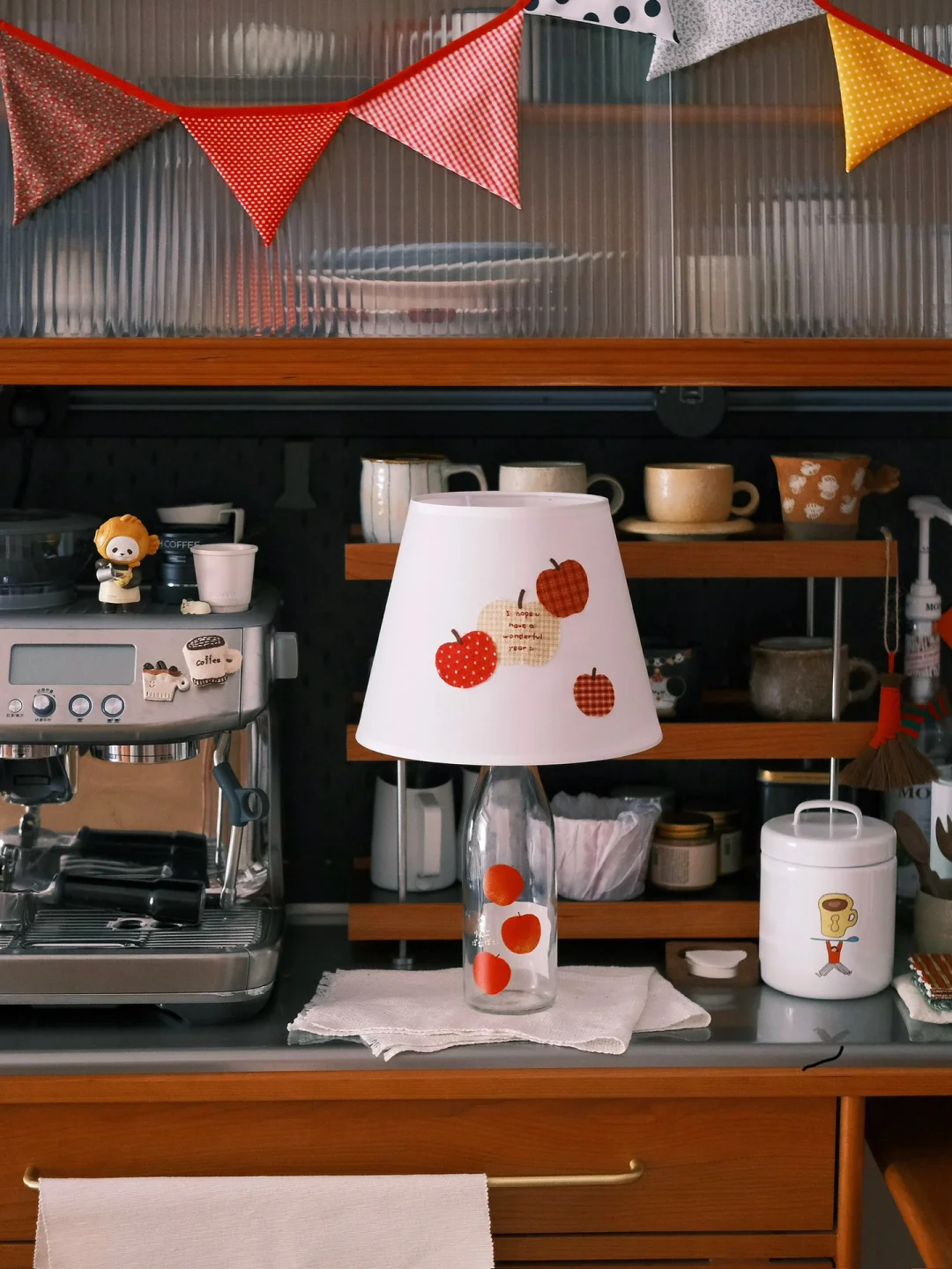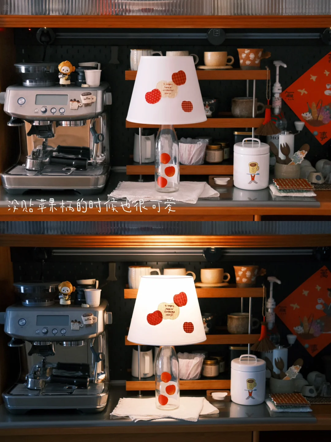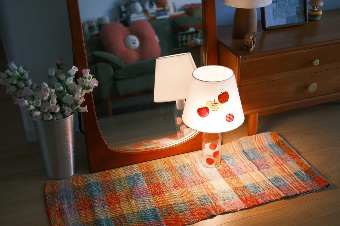 这只苹果清酒的空瓶是家里的老演员了 每年春天都会被拉出来酒瓶插花 最近刷到了好几回酒瓶灯 狠狠心动 用之前剩的布料拼贴了苹果灯罩 组合再一起 再找一只充电灯泡 家里的苹果元素再+1!