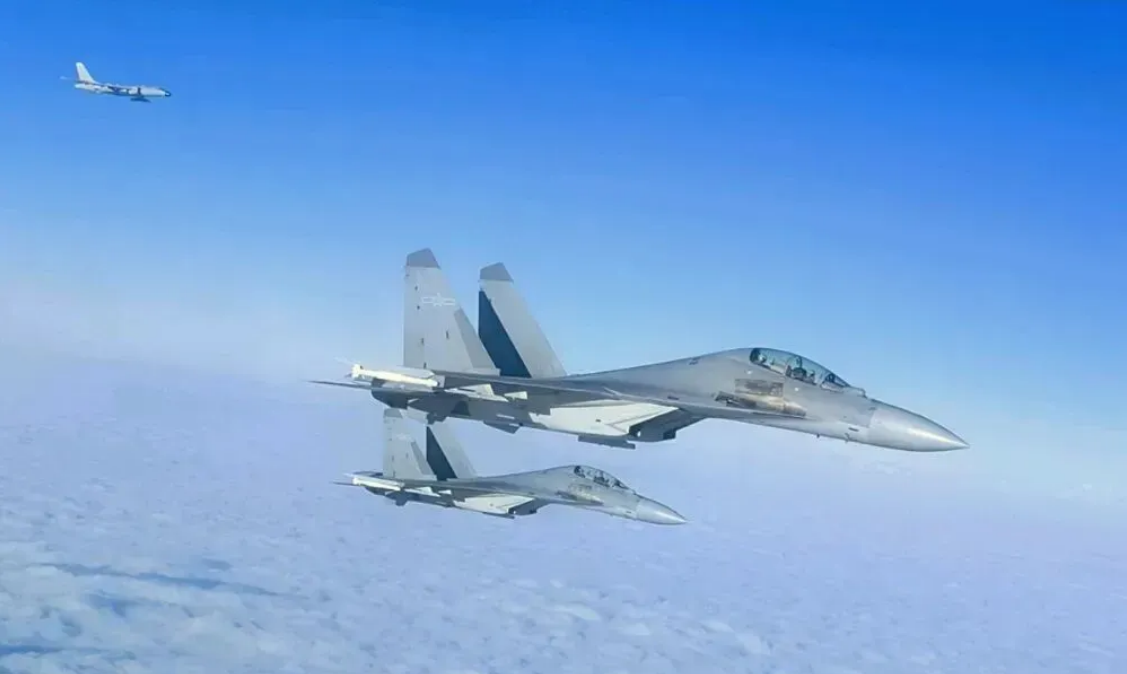 第三起事件,发生在台湾岛西北方向空域,一架J-16战斗机紧贴在轰-6K轰炸机下方飞行,利用轰炸机庞大的机身作为掩护,以规避台军雷达探测。