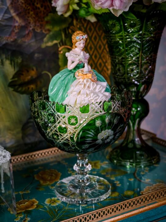 终于把我收藏的西洋古董蕾丝瓷偶和绿色水晶器物摆在一起,阳光洒下来的瞬间——天!这根本就是博物馆里的静物油画成精了吧!西洋古董蕾丝瓷偶 绿色水晶花瓶 家居饰品 家里花瓶 实用摆件 桌面摆件 瓷偶娃娃 水晶花瓶 水晶果斗