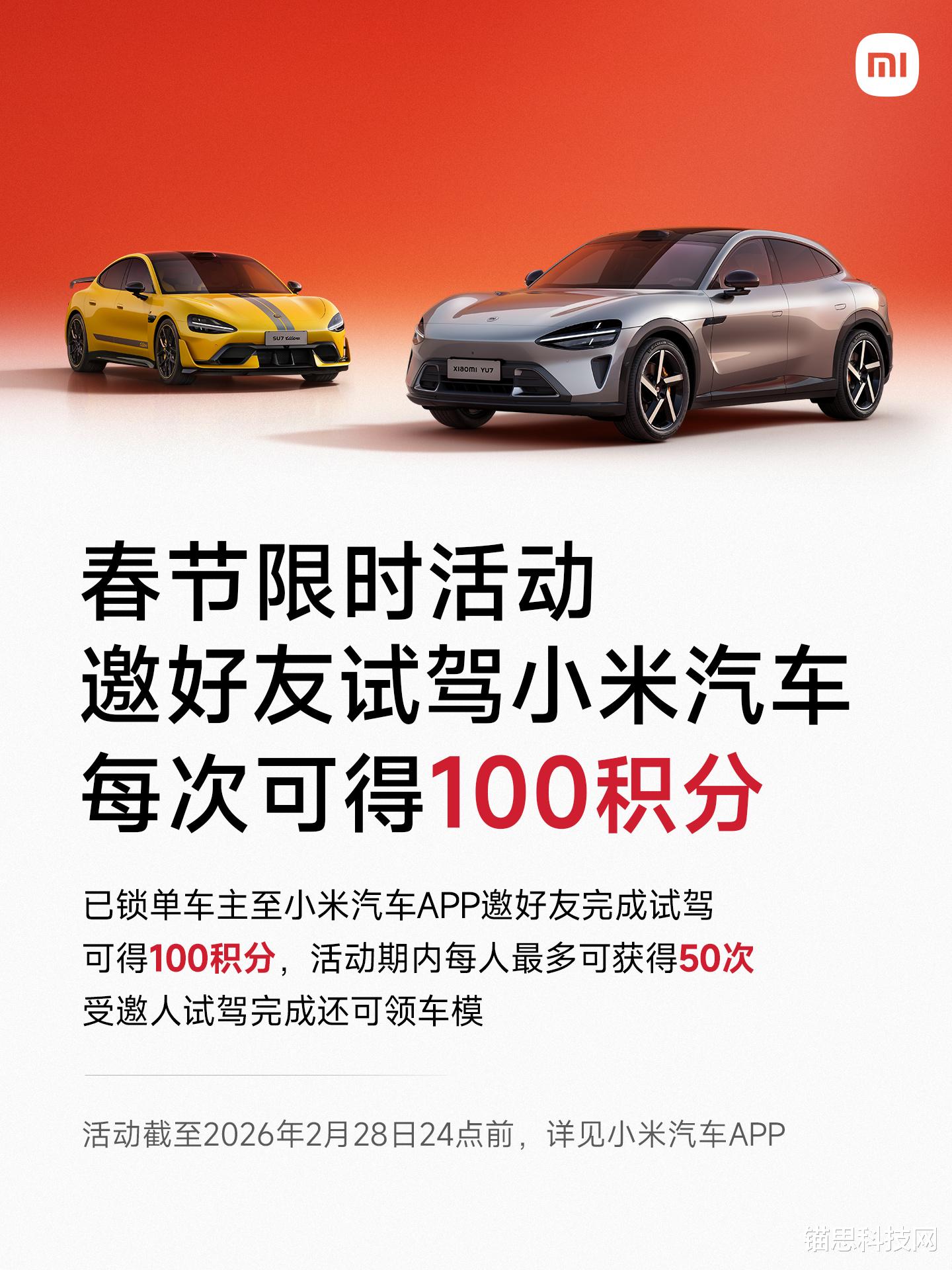2月14日消息,小米汽车今日正式宣布推出春节限时福利活动,活动核心为已锁单车主邀请好友参与试驾、锁单或小订新一代SU7,即可获得相应积分奖励,活动有效期截至2026年2月28日24时,兼顾福利回馈与新车推广,进一步提升用户参与度。