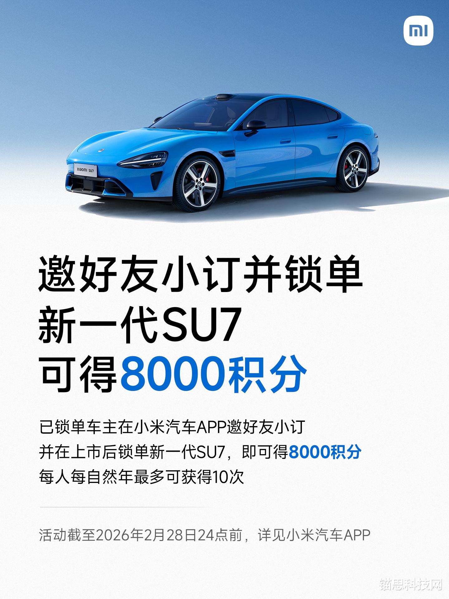邀友小订新一代SU7得积分:已锁单车主通过小米汽车App邀请好友小订新一代SU7,并在新车上市后完成锁单,即可获得8000积分/次,每人每自然年最多可参与10次,与邀友锁单权益共享年度上限,助力新一代SU7扩大预订量。