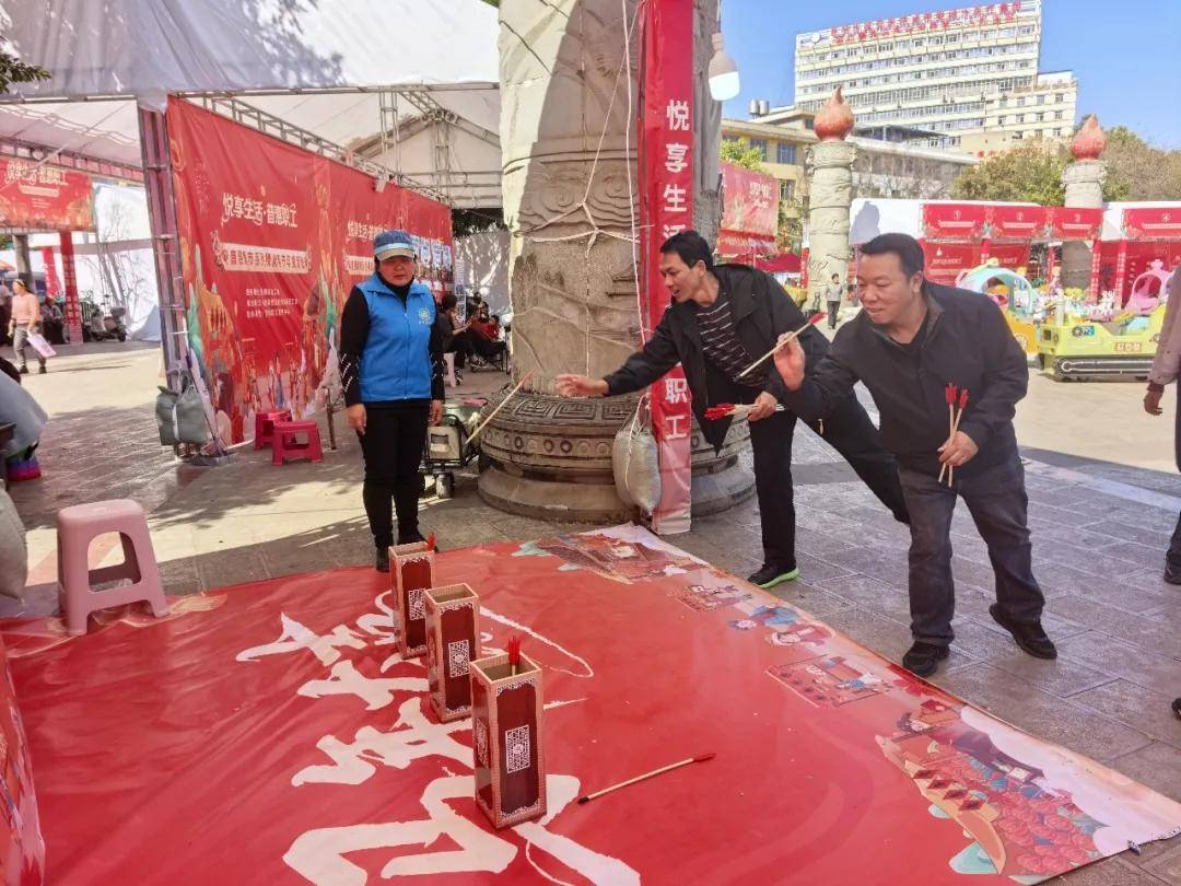 不远处的“骑骥投壶·纳福迎祥”区则更考验眼力和手感。不少职工在此一试身手。手握“羽箭”,凝神屏息,向着精致的壶筒投去。“中了!”每当有箭入壶,周围便响起一片喝彩声。欢声笑语中,传统游戏的韵味与工会关怀的暖意交织在一起。完成两项游戏的职工,就可集齐印章,兑换一张额外的线下满减消费券。这张券与线上领取的普惠券叠加使用,让职工在接下来的年货采购中享受“折上折”。游园会不仅带来了欢乐,更成为连接线上福利与线下消费的趣味桥梁。