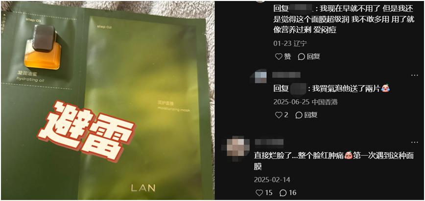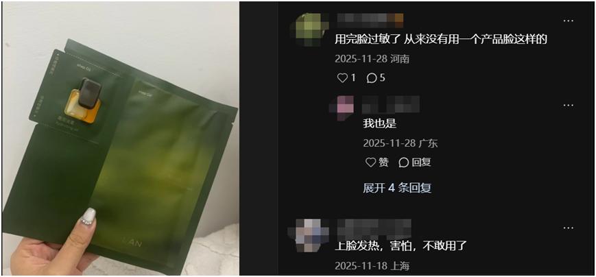 值得关注的是,消费者张先生在实际使用LAN品牌相关产品的过程中,曾察觉到其带有明显的刺激性气味。他进一步向记者表示,自己通过社交媒体(如小红书)等平台进行搜索后发现,类似情况并非个例,有多位消费者均反映了相同问题。在这些反馈中,部分消费者更是直接指出,使用该产品后曾出现了过敏等皮肤不适症状。
