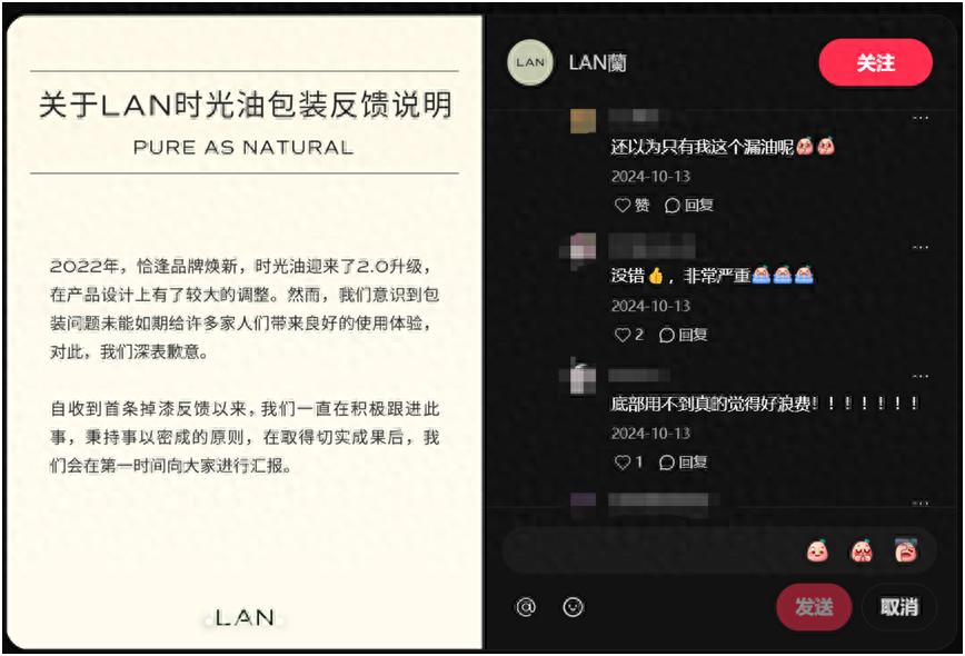 事实上,早在2024年10月12日,LAN品牌就曾发布《诚挚说明 | 一条关于LAN时光油包装的反馈》称,2022年品牌升级推出时光油2.0时,因包装设计调整导致盖子掉漆,影响使用体验,我们深表歉意。经排查,问题源于沙林材质盖在热胀冷缩下易掉漆。我们已通过优化油漆配方解决该问题,改进后产品于2024年10月9日入库,并在双十一陆续送达消费者手中。