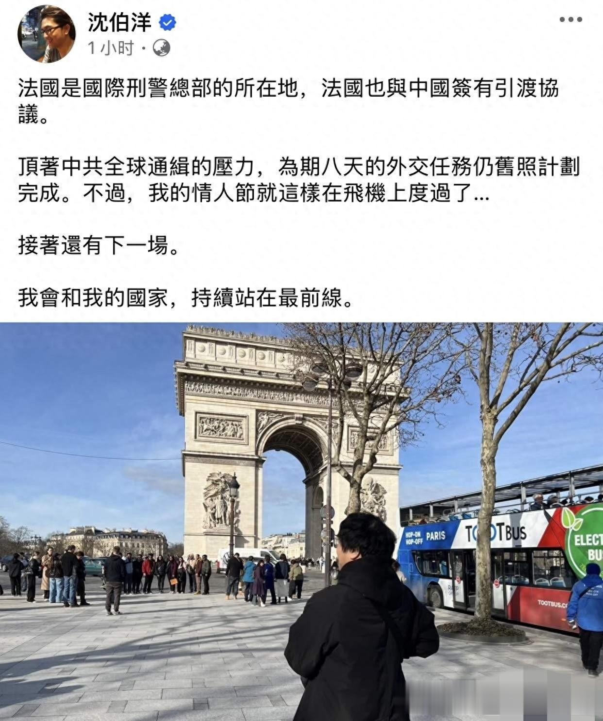 今天(15日),被大陆立案侦查的民进党立委沈伯洋在窜访法国后发文叫嚣,“顶着中国全球通缉的压力,为期八天的外交任务仍旧照计划完成。接着还有下一场,我会持续站在最前线。”