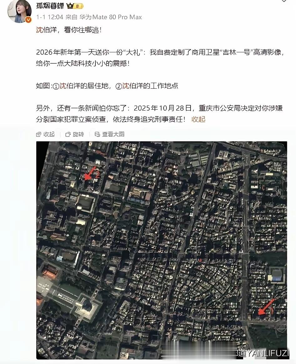 就在2026年元旦那一天,媒体人孤烟暮蝉,就用“吉林一号”定位了沈伯洋的住所和办公场。