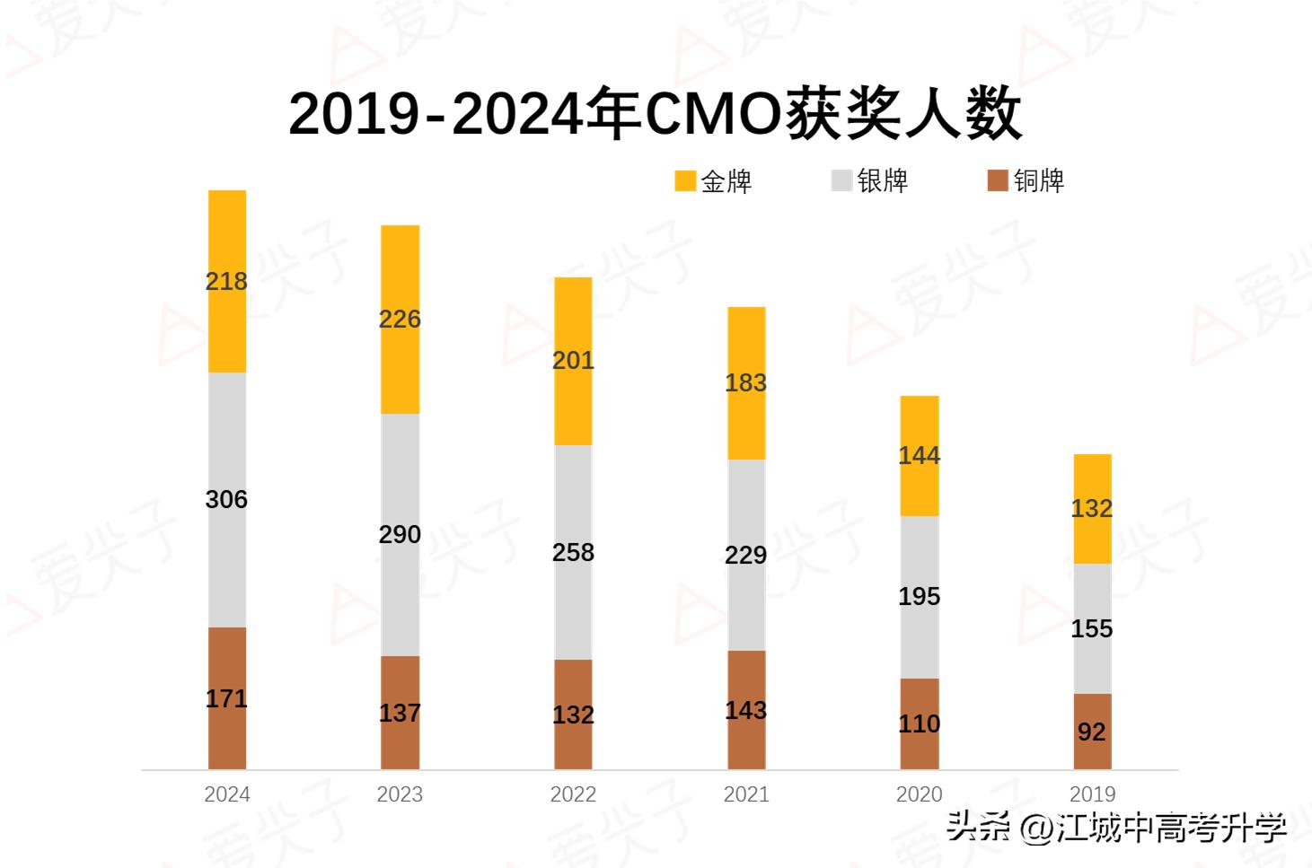 六年CMO参加总人数年均增加约63人,银牌成为扩容主力;金银铜牌比例从2019年1.43:1.68:1演变为2024年1.27:1.79:1,银牌与铜牌的层级差距扩大。