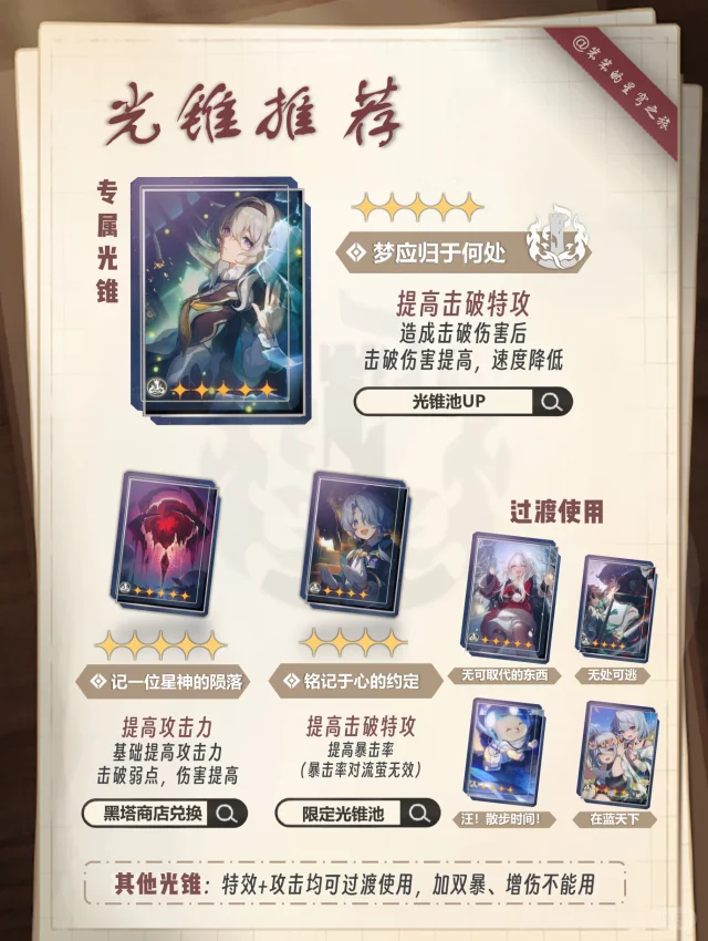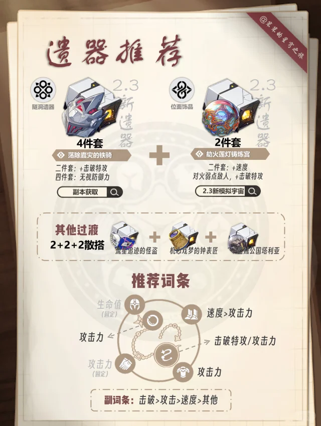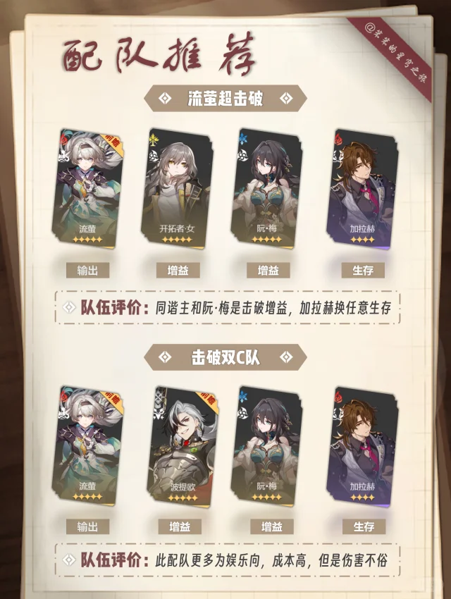 🐱大家好,我是笨笨的铲屎官 今天给大家带来的是流萤的培养攻略 数据来自于官方创作体验服,仅供参考 细节以上线实机为准 --------------------------------- 👉流萤作为匹诺康尼高人气角色 想必开拓者们都已经期待已久了 流萤主打击破伤害 因为攻击力可以转击破特攻 所以专武的下位替代较多 遗器的话,2.3会上线2套击破套 配队:流萤+阮·梅+同谐主+加拉赫最佳 至于阮·梅、专武、星魂如何选择 笨笨推荐0+0>阮·梅>2魂>专武 仅供参考,大家根据自己的情况选择