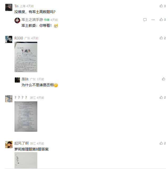 但《率土之滨》的玩家们显然不这么想,8月2日当天,率土官方公众号转发了由率土玩家自制的三国知识考卷,更令人难以置信的是,前来答题的玩家不但很多,还在评论区叫嚣着题太简单了根本不够刷。