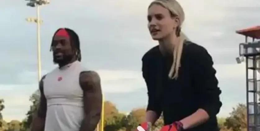 采访弗拉格的女记者叫凯特乔治,她是一个选美小姐出身的排球运动员。 之前有个女记者因为采访弗拉格被中国球迷热议,因为长得确实太美了,而且是属于符合我们国人审美的那种西方金发美女,类似杰西卡阿尔巴的那种。 这个记者是ESPN的,叫做katie george,她身上有个最有趣的故事,是在2019年东部决赛的时候, 凯尔特人的一个球员在赛前训练时被她给迷住了,一直盯着她看而无心训练,导致手里的球都丢掉了。 另外骑士队的当家球星米切尔也在社交媒体上关注了她,当时还有传闻说米切尔在追求她,不过现在米切尔都订婚了就是纯传闻。 她长得这么漂亮为什么来当记者呢?其实本来就是拿到过州选美小姐的荣誉的,只是运动天赋同样有,大学时期加入了排球队,后来发现智商情商都很高,最适合来当全方位的记者来采访各路运动员, 这才在记者行业里扎根了。