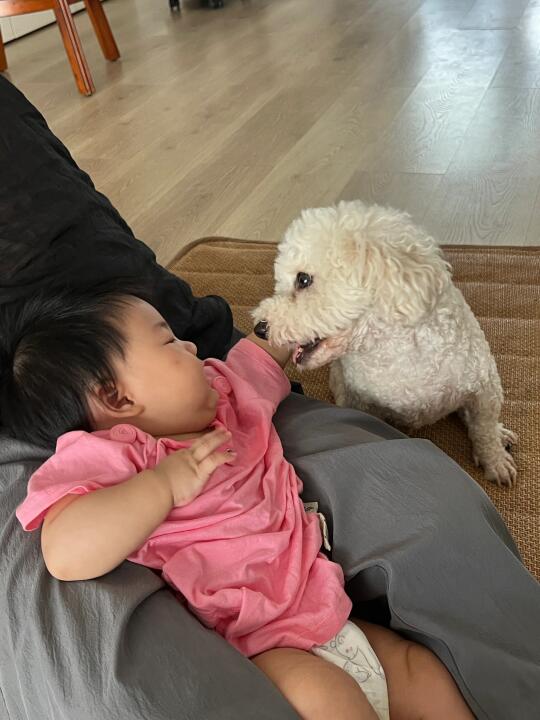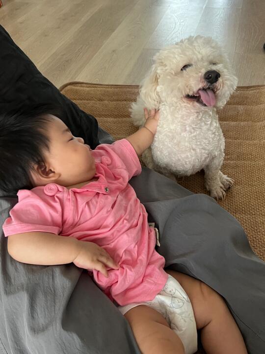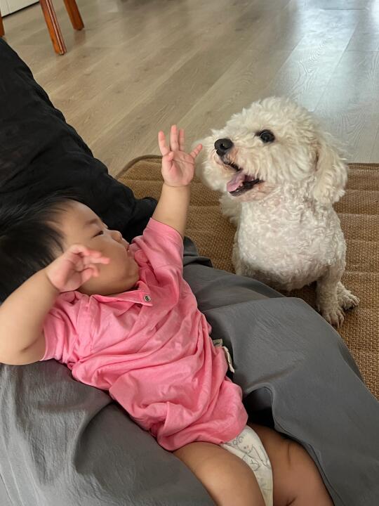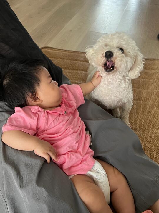 P1到P6是一组有声音的Livephoto连环画, 当我和宝宝玩耍的时候发现我的小狗在后面静静看着我的时候,我尝试着让宝宝去触摸它 宝宝从一开始不会摸小狗,小狗也不敢动,害怕吓到宝宝,到最后它俩的双向奔赴 我知道,距离两小只一起玩耍的日子不远啦! 永远被小狗的温暖治愈😭