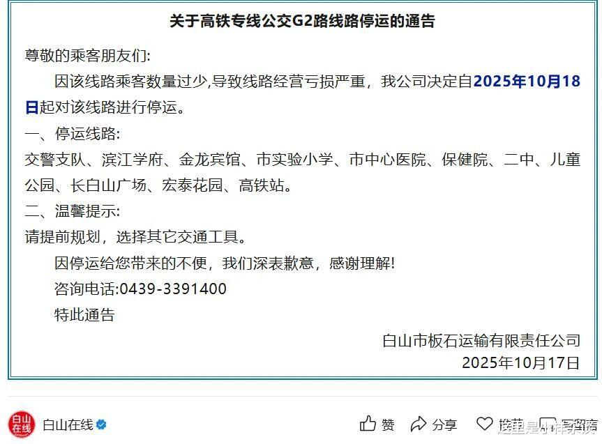 在前天已经官宣了,自2025年10月18日起这条线路停运,而停运的原因就是乘客过少。没想到这一天来的这么早这么突然,国庆节刚过去没有多久,还不到一个月,就结束了,这条线路可以竞选一下公交运营时间最短记录了吧。但是这也没有办法,虽然是公交,也不可能天天半个多小时一趟在那里运椅子。那么下一条会是哪一条呢?通化站,开通9条高铁站公交专线白山东站,新开通(延伸)4条高铁公交专线,新开通临江市至高铁站城际公交专线。在江源东站,延伸1条城市公交线路(配车10台)至江源东站。在长白山西站,新开通高铁站至华美胜地度假区等7条客运班线。抚顺站新开高铁1号线和高铁2号线,延伸7路、21路、30路等7条公交线路。伯官站开通沈抚102路、110路支线和沈阳308路。大家觉得下一条可能关停的会是哪一条线路呢?