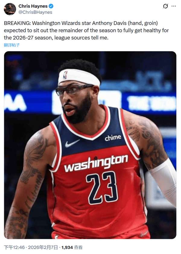 北京时间2月7日,NBA常规赛继续进行。根据名记Chris Haynes报道称,奇才队中锋戴维斯本赛季报销,目标将在2026-27赛季健康归来。