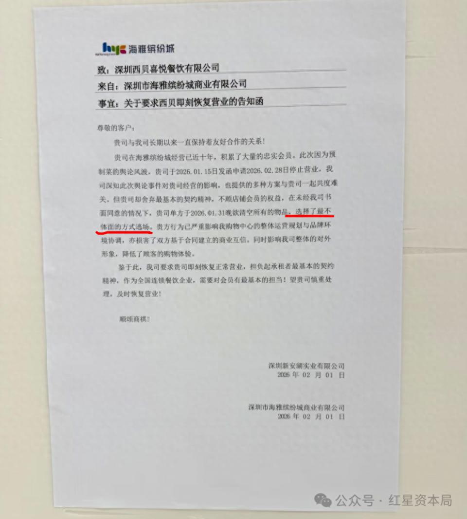红星资本局2月3日消息,近日,一张深圳某商场内张贴的《关于要求西贝即刻恢复营业的告知函》在社交媒体流传。《告知函》要求该商场的西贝门店即刻恢复营业,写道西贝“不顾店铺会员的权益”“选择了最不体面的方式逃场”。