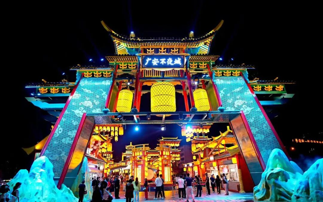 广安不夜城也是热闹非凡。这里汇聚了各种特色美食、手工艺品和文创产品,游客们可以一边品尝着地道的美食,一边挑选着心仪的纪念品。市集里灯火辉煌,人来人往,充满了浓浓的烟火气,让人仿佛置身于一个繁华的古代街市。