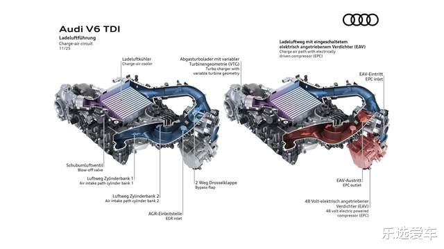 当油门踩到底,涡轮增压器能量有限时,进气会被引导到电力驱动的压缩机。空气已被排气驱动涡轮压缩,进入燃烧室前被进一步压缩。结果是在低转速时获得更大扭矩,几乎没有涡轮迟滞。奥迪甚至声称最新的V6柴油发动机的响应性能可媲美同功率电动车。