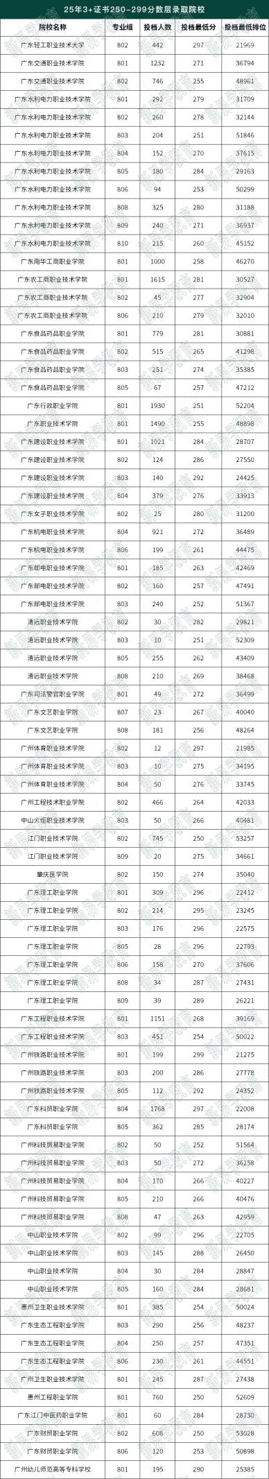 250-299分分数段涉及34所公办院校的81个专业组,广东轻工职业技术大学、广州铁路职业技术学院等院校的多个专业组投档最低分集中在270-299分之间。