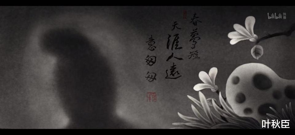 屏风之上写的“春梦短,天涯人远意匆匆”,与唐寅(唐伯虎)的《杏花图》有关,原句为“香雪一庭春梦短,天涯人远意匆匆”。动画对此进行截取,是为了用这些字来暗示书生的命运,也是高度浓缩整个故事的引子。