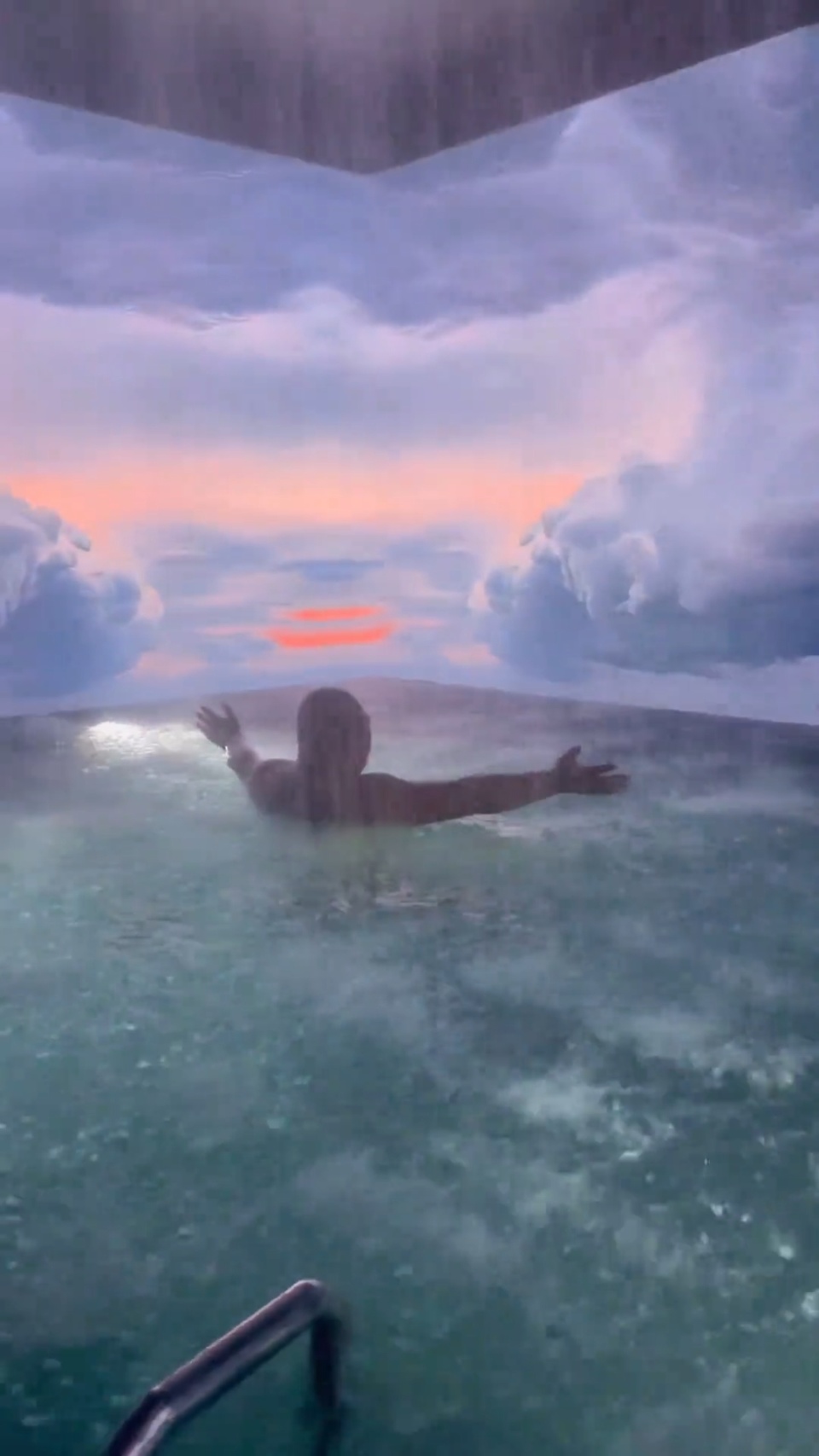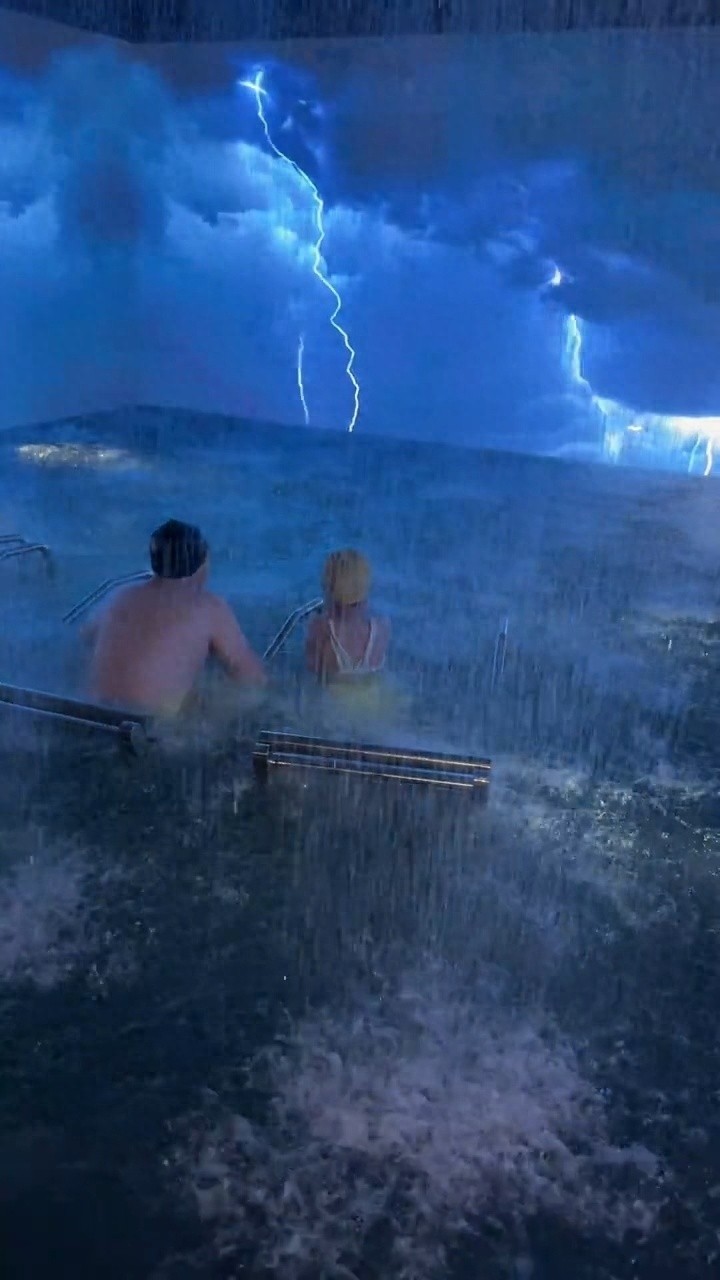 多段视频画面显示,浴池内水柱从上方倾盆而下,四周电子屏幕上动态展示有雷电暴雨、旭日东升等气候,还有大雨滂沱和雷电的模拟音效,现场氛围显得十分神奇。在评论区,有网友调侃表示,在这洗浴洗完是不是就“法力无边”了。