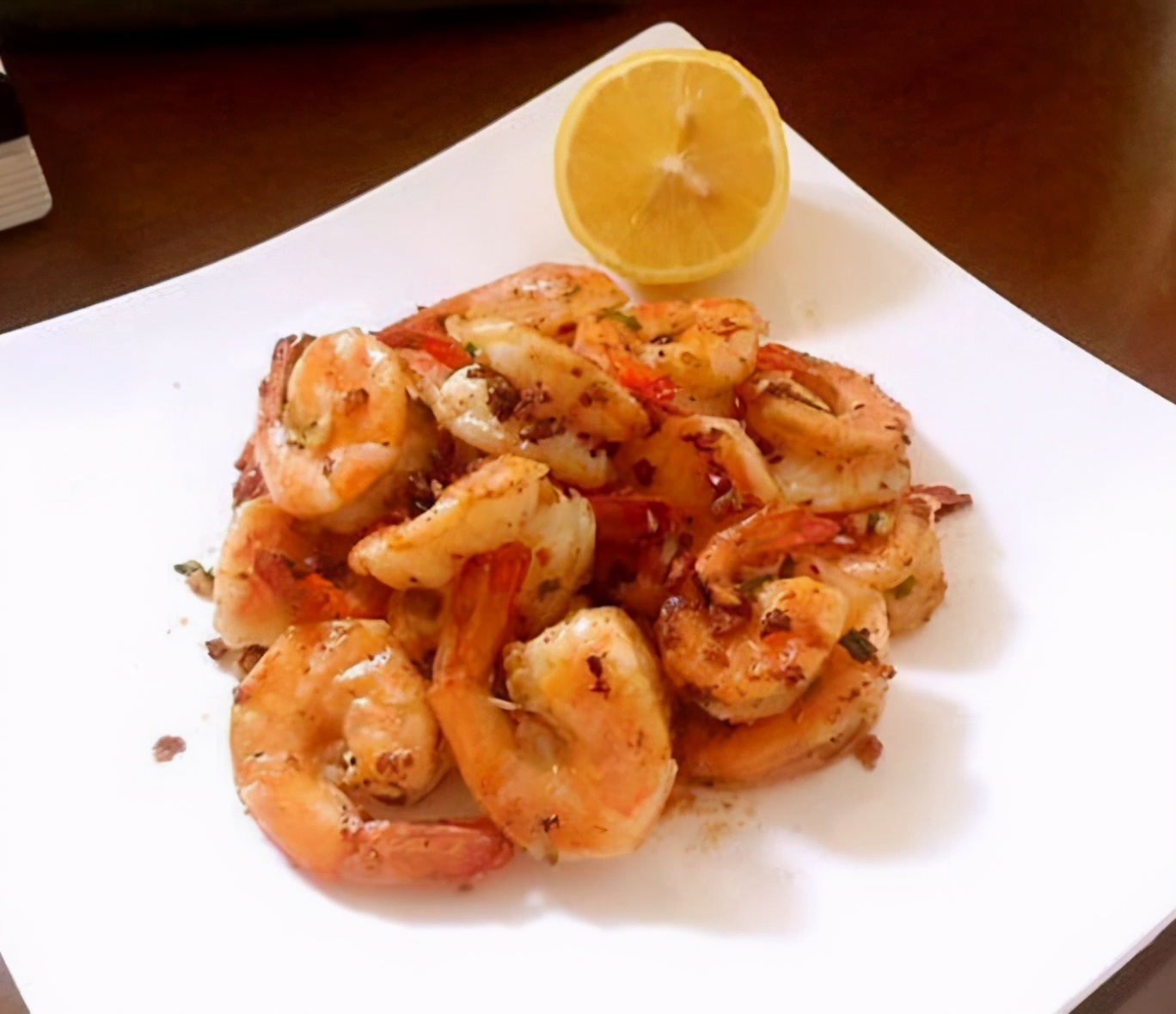 4.快速翻炒至大虾变红,卷曲。淋一点柠檬汁 ,颠两下,就好啦。(从大虾下锅到起锅,绝对不超过五分钟的)装盘,可以再撒一点意大利香料碎。