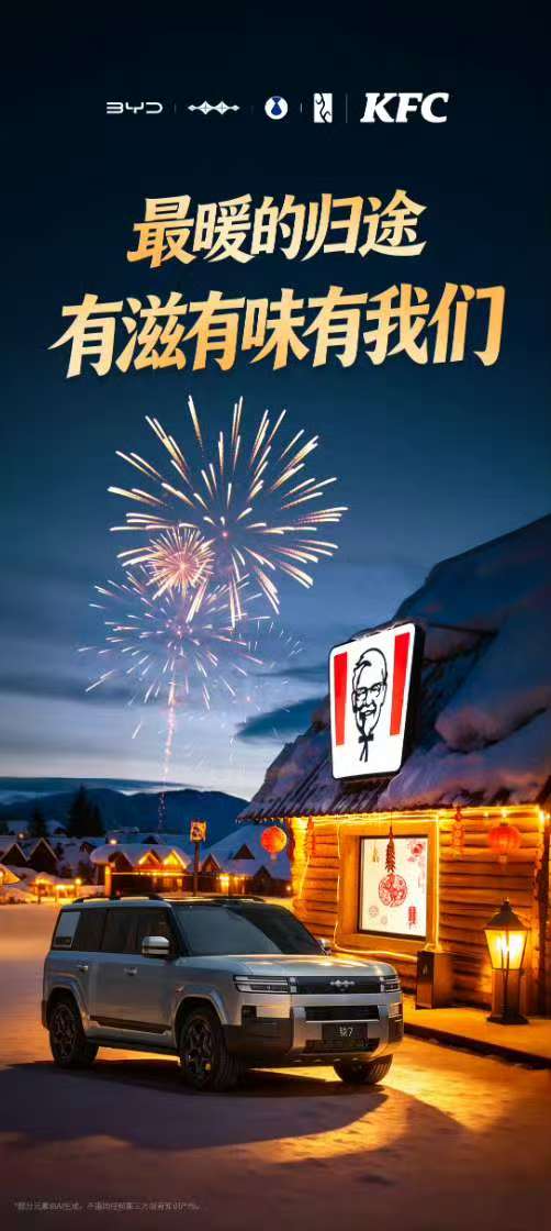 一个负责归途体面,一个承包年味速食,两大国民品牌强强联手,精准戳中年轻人与家庭用户。依托比亚迪技术实力与肯德基海量门店与会员,这场跨界不仅送福利、造热度,更是解锁更多的出行+美食新可能。返乡路上吃炸鸡、抽新车,马年好运直接豹发!